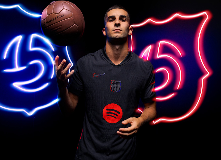 The 2024-25 Barça primary change for the Spanish La Liga Catalan side is in black with blue and red trim, it has a black crest and supplier’s “Swoosh” logo made from TPU to be reflective - and with bordering split between blue and red - and the logo of sponsor Spotify is also in red.
