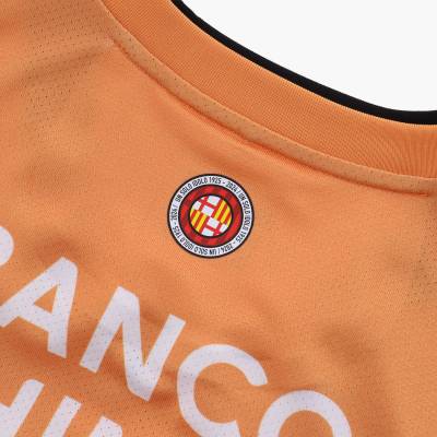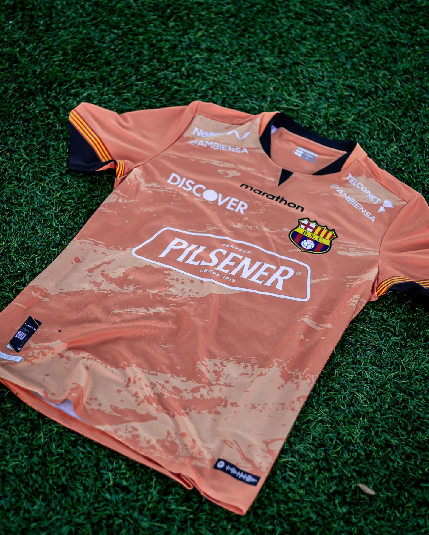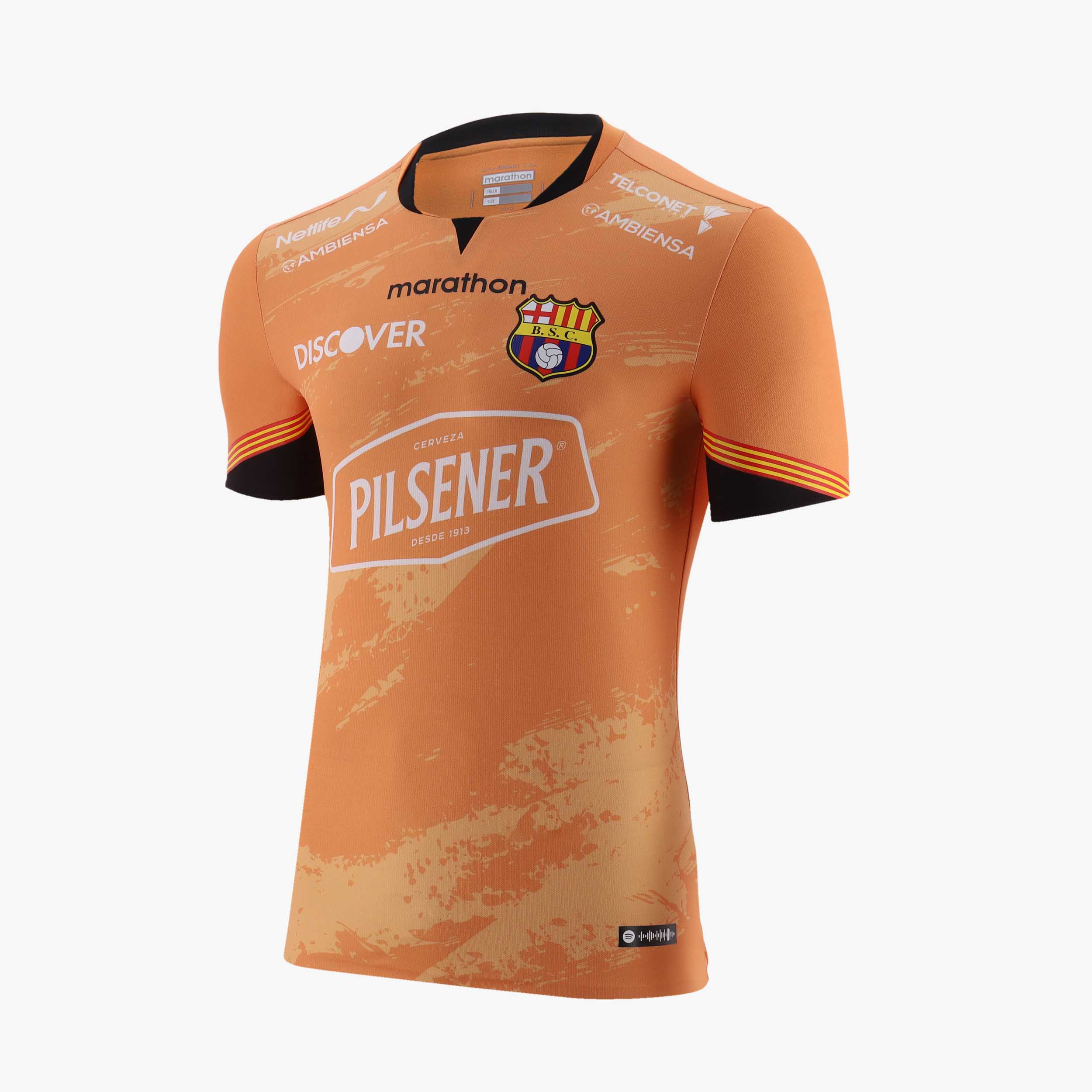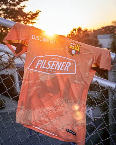 There are also Senyera- like angled bands on the sleeves, the crest is in full colour and partner logos, other than the black Marathon wordmark, are in white, and the Guayaquil-based club have debuted the shirt - looking far more orange than in the launch images - with peach/orange shorts and hooped socks that complete the kit.