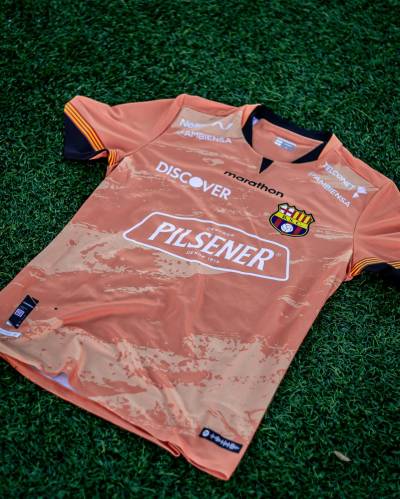 The Ecuadorian Serie A side’s 2024 primary-change release is in a soft peach tone with tonal graphical embellishment to the front of the trunk and black trim.