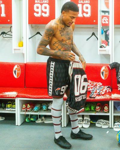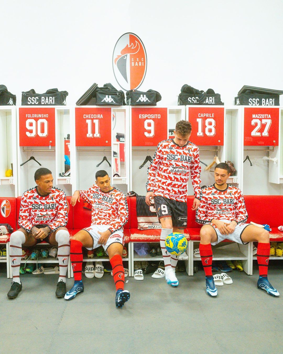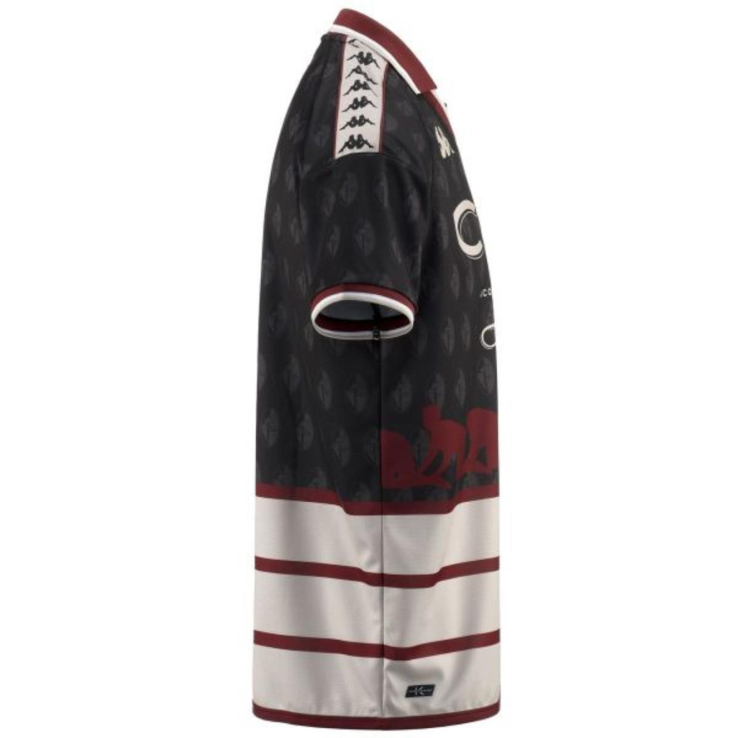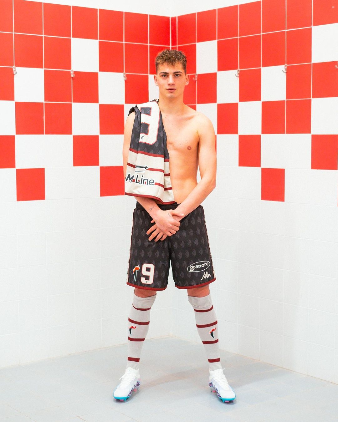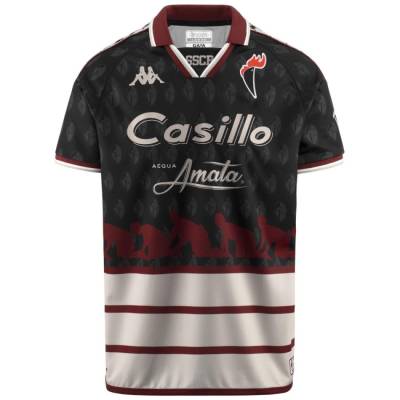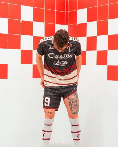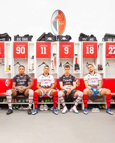 Born of a collaboration between SSC Bari, supplier Kappa and local designer Leonardo Colacicco’s fashion house, LC23, the design is in black/greyscale combined with beige/off-white and red and includes a depiction of Bari’s famous “Trenino” (little train) celebration.