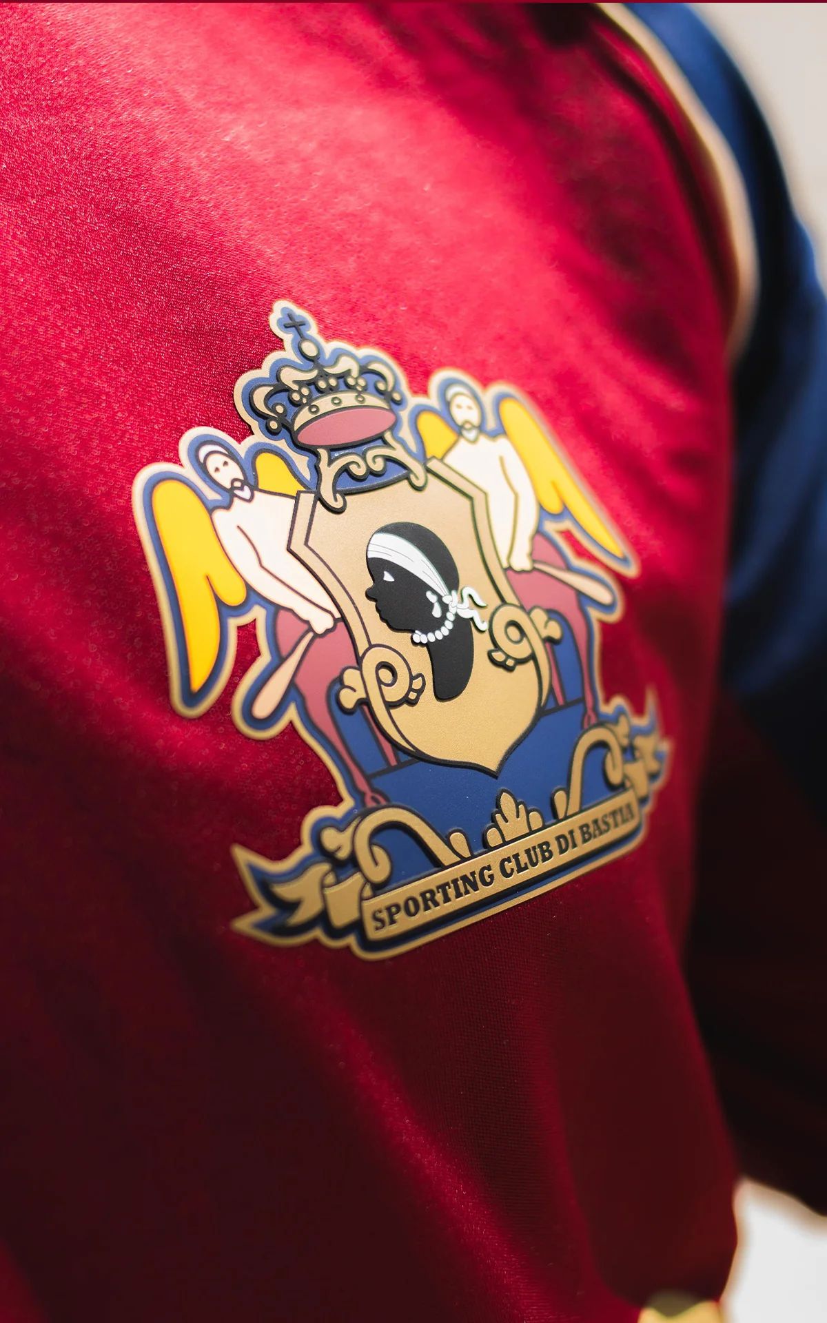 The shirt pays tribute to Corsican identity, carrying the words 300 anni, una memoria, una fiertà (300 years, a remembrance, a pride.) as part of the campaign message. It is designed in a deep burgundy base with gold accents, including the collar, piping, and adidas branding. The sleeves are navy, adding contrast to the overall look, while the shoulders carry the three stripes in gold.