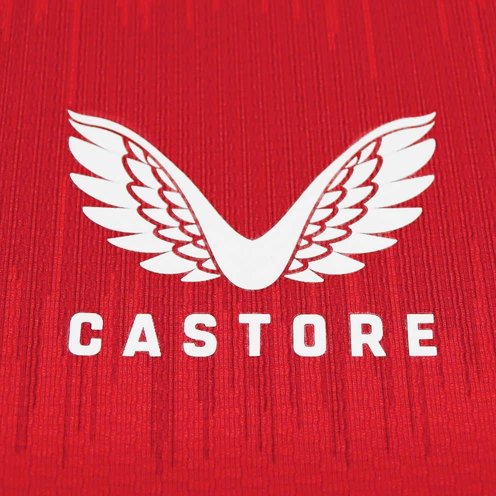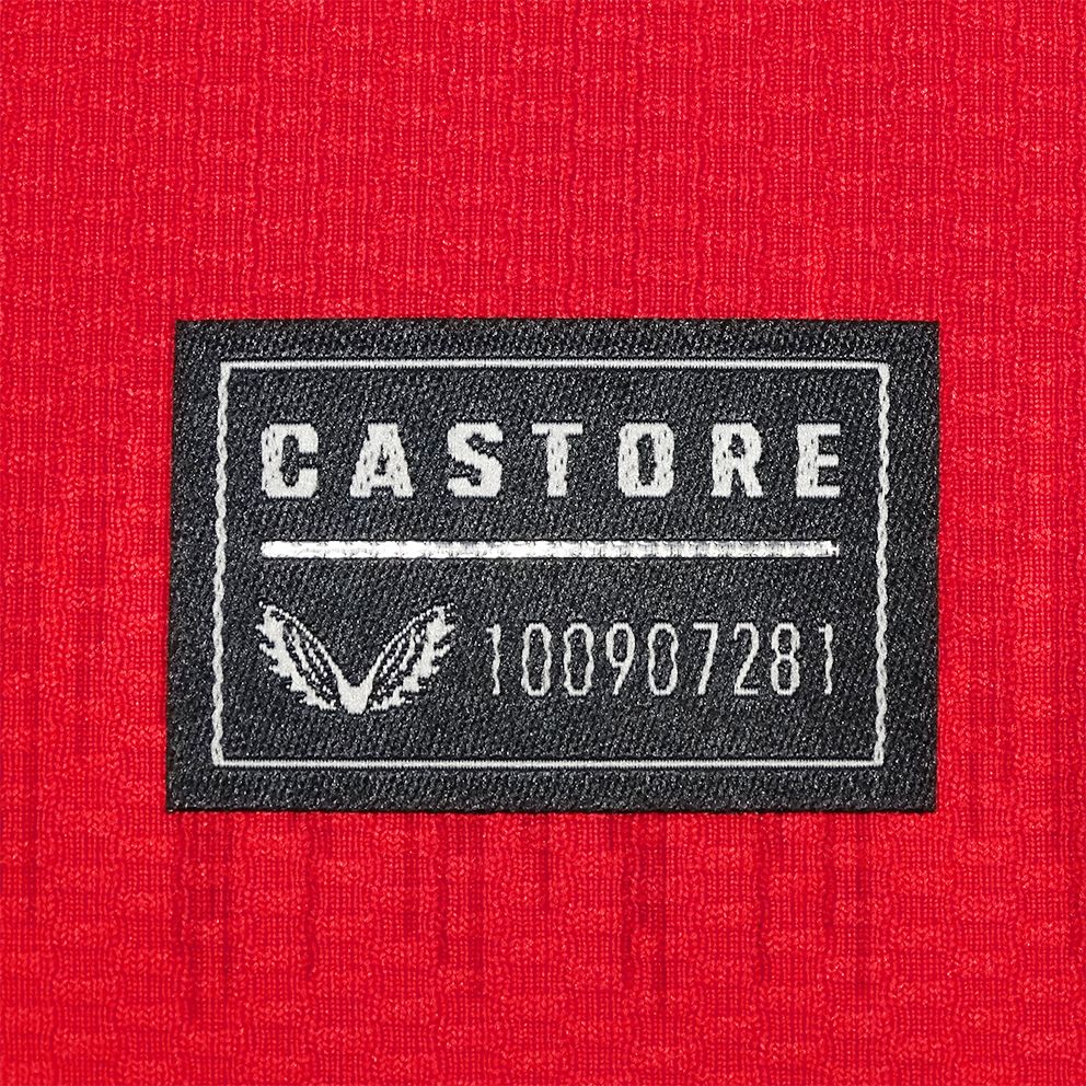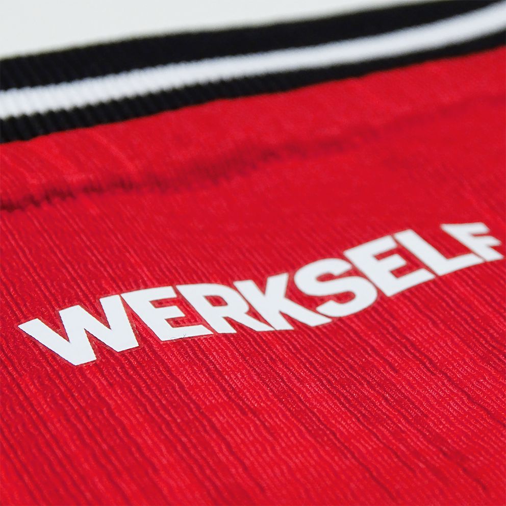 This addition is inspired by the “LEVERKUSEN ALLEZ” fan song, while this is overlaid with the full-coloured crest and the Castore chest logo, “Barmenia” print and, on the reverse, the “WERKSELF” print all in white.