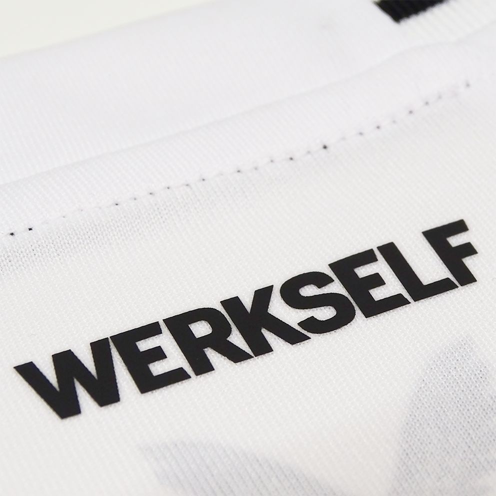 Further embellishment - the partner logos and the “WERKSELF” print on the upper back - appears in black, while the “Better Never Stops” script on the inside hem of the reverse “appears” in red.