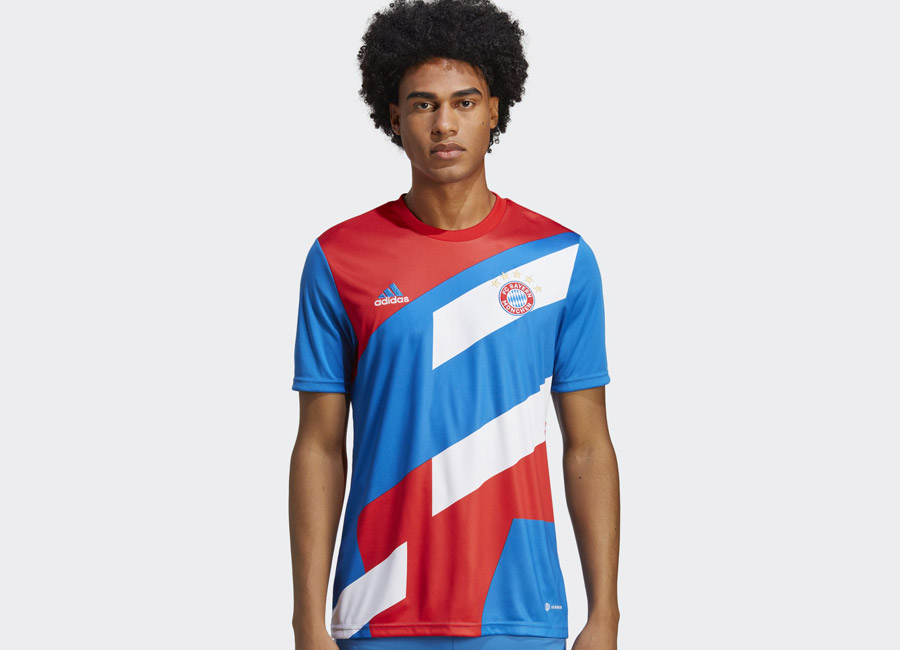 Blue is often a controversial feature on Bayern shirts but features prominently - along with red and white - on this warmup release.