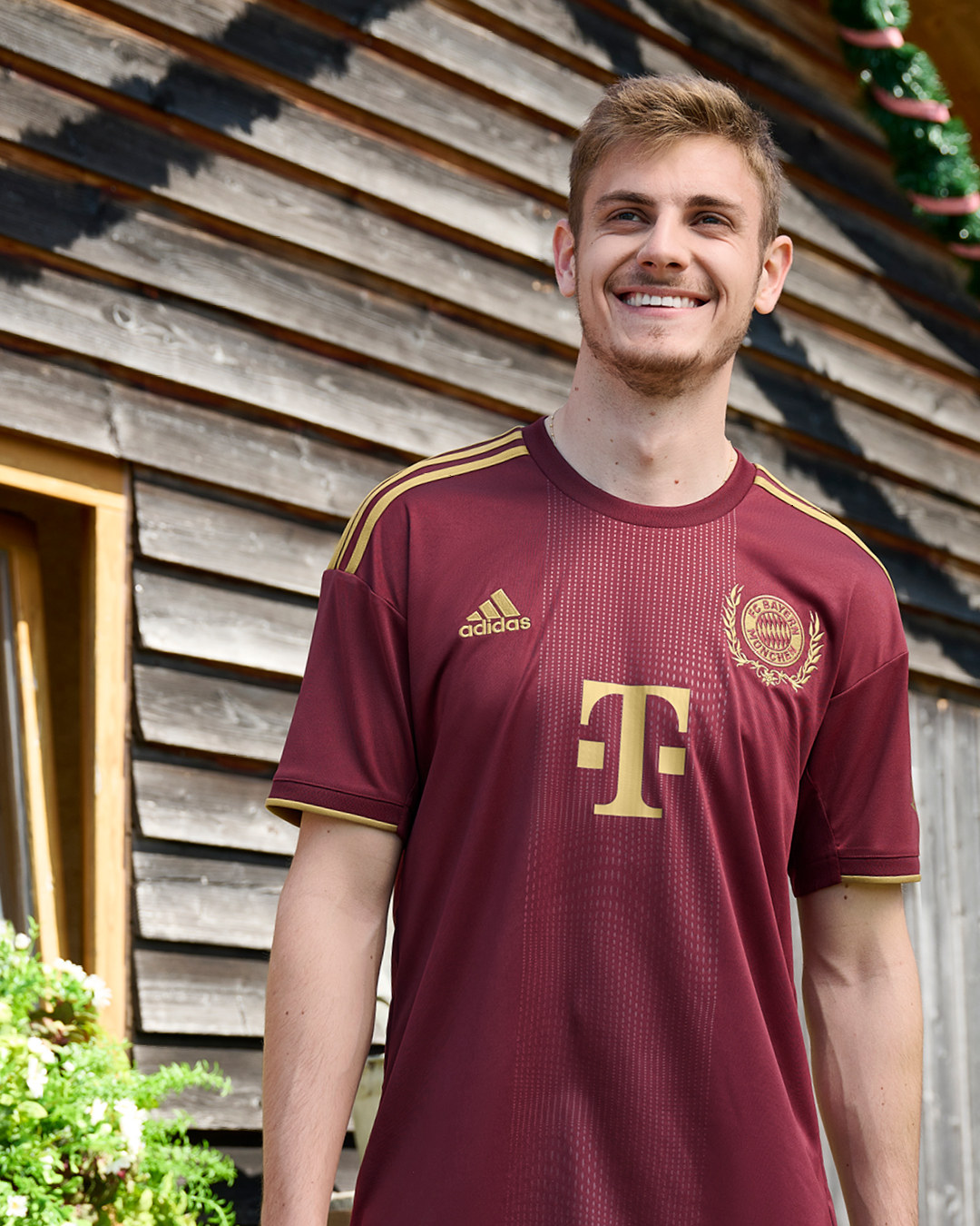 The badge, accents on the sleeves, the three stripes on the shoulders and the sponsors stand out in a golden colour like last year, creating a link to classic Bavarian clothing.