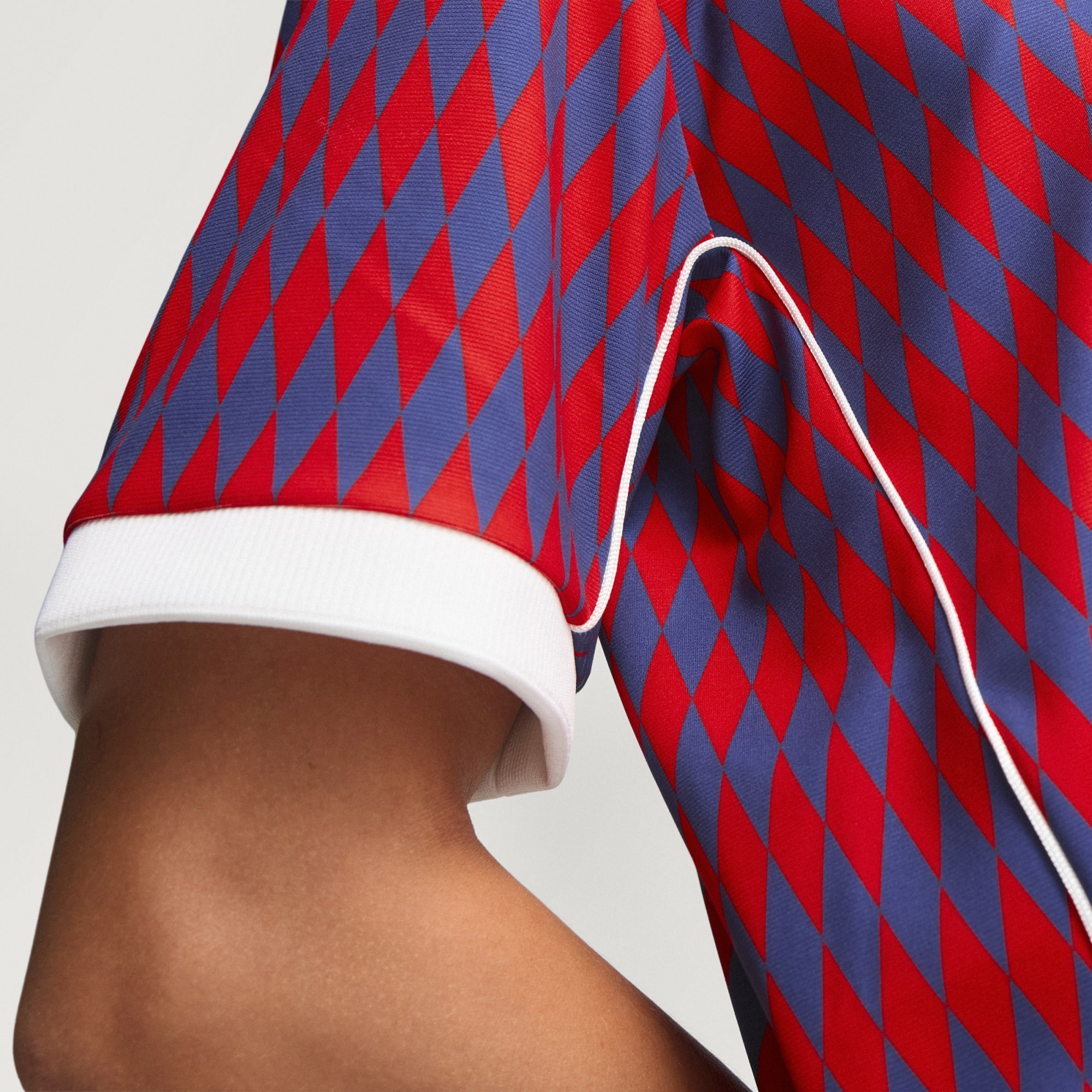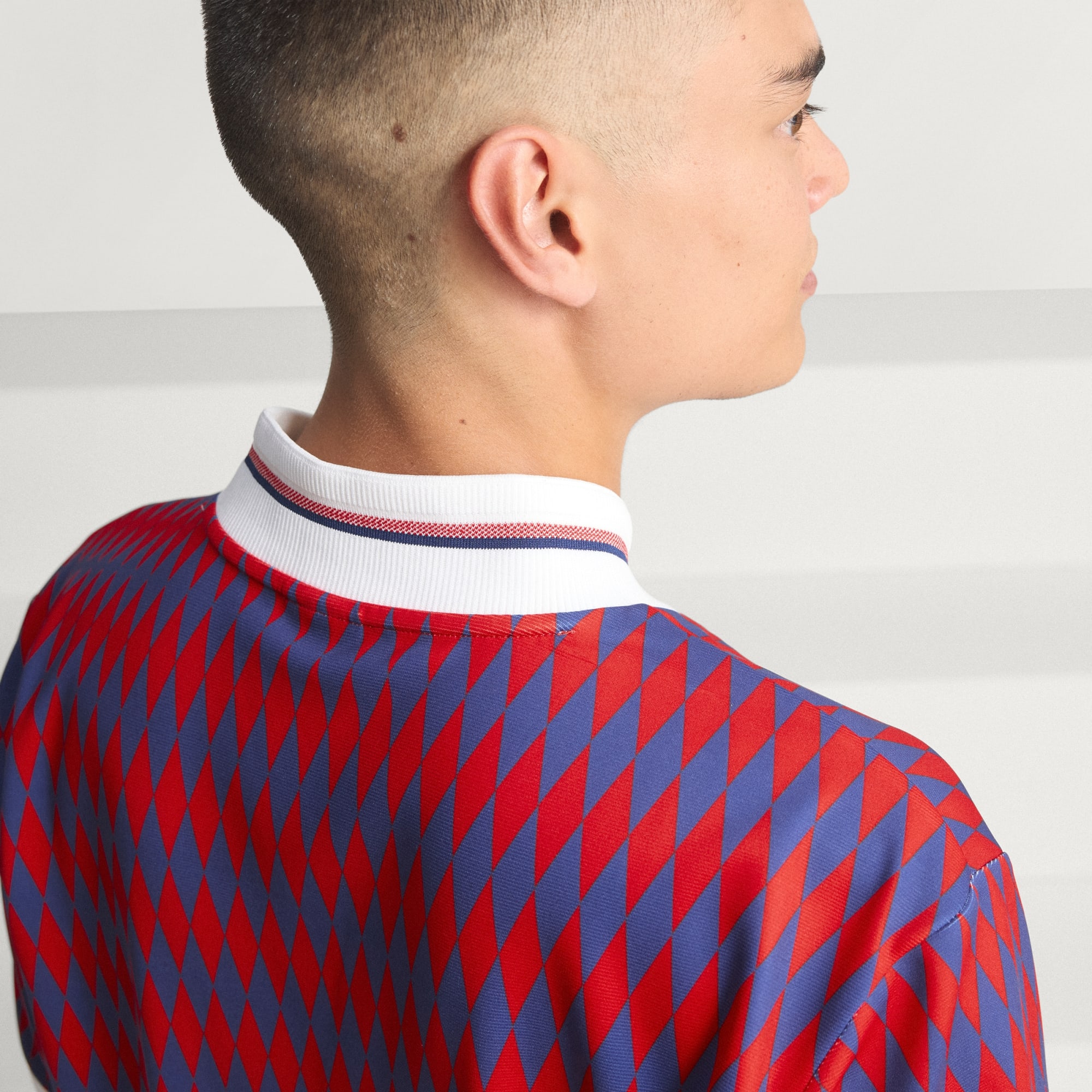 The adidas originals shirt presents Bayern’s familiar red and blue colours arranged in a diamond pattern inspired by the Bavarian flag, while the collar features a white ribbed crossover V-neck with thin red and blue stripes running through it.
