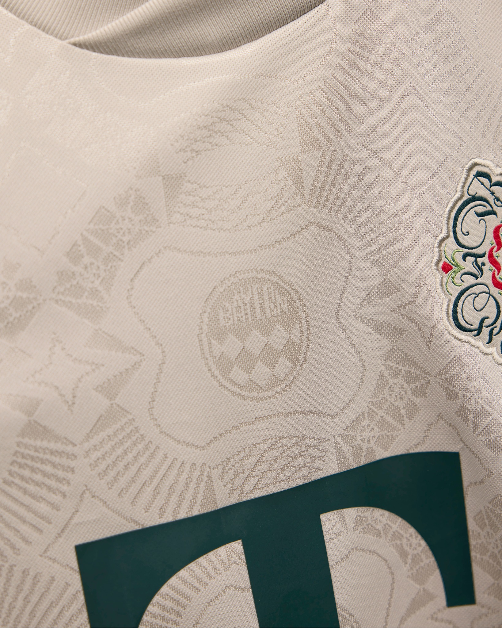 The adidas FC Bayern jersey is presented in a Beige base with dark green detailing. Green stripes run across the shoulders, while patterned sleeve cuffs incorporate green and red decorative elements inspired by Bavarian motifs. The chest carries the Telekom sponsor logo in dark green, with the adidas Trefoil placed opposite Bayern’s Oktoberfest crest, a design created exclusively for this collection. The shirt fabric features a subtle jacquard pattern that references the earlier 125th anniversary kit.