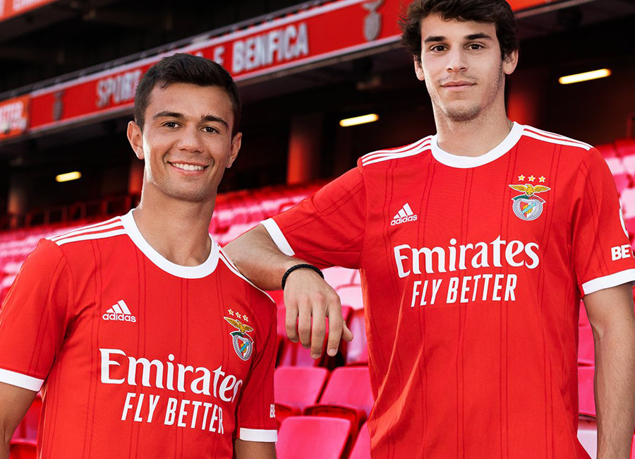The Lisbon-based Portuguese side’s 2022-23 design is in red with white decoration - in the main, the German manufacturer’s branding, the crew neck and the sleeve trim.