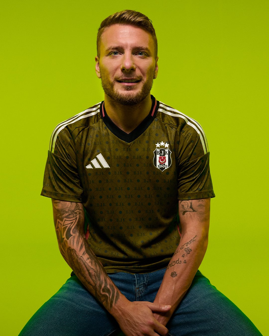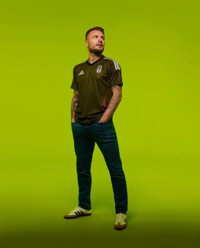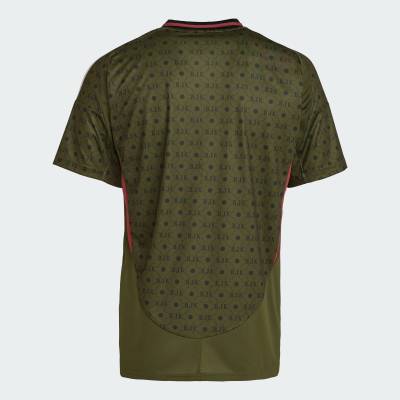 The new adidas quaternary release is in a military shade of green with a sublimation pattern that incorporates Kara Kartallar’s famous initialism, with the crest in full colour, the supplier branding in white - including the shoulder stripes and the “3-Bar” chest logo - the neck in black and trim in pink.
