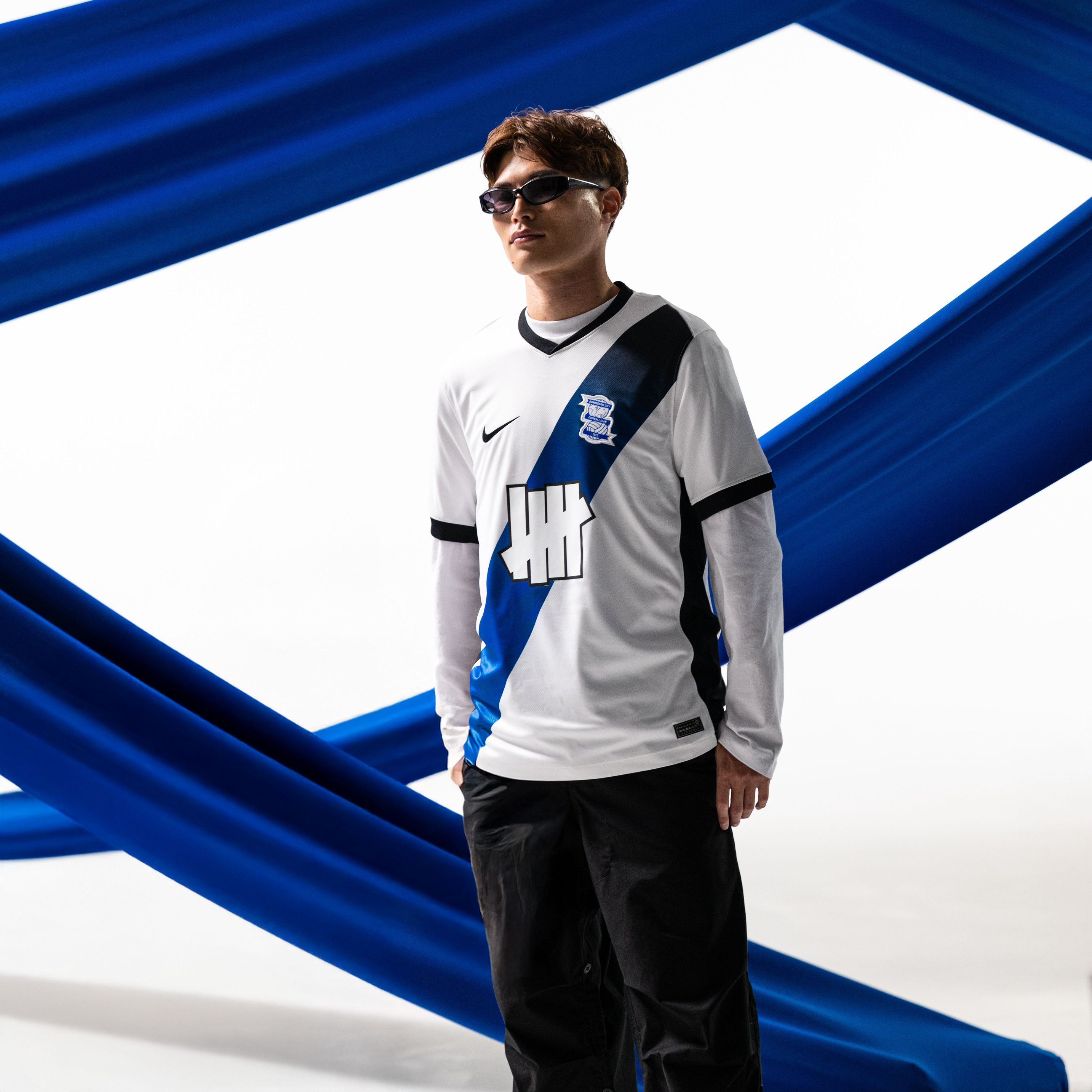 The shirt features a white base with a sash that shifts from black to blue, referencing the club’s original colours and coat of arms. Black detailing includes a Nike Swoosh, trim, and UNDEFEATED branding across the front, while the club crest sits on the left chest.