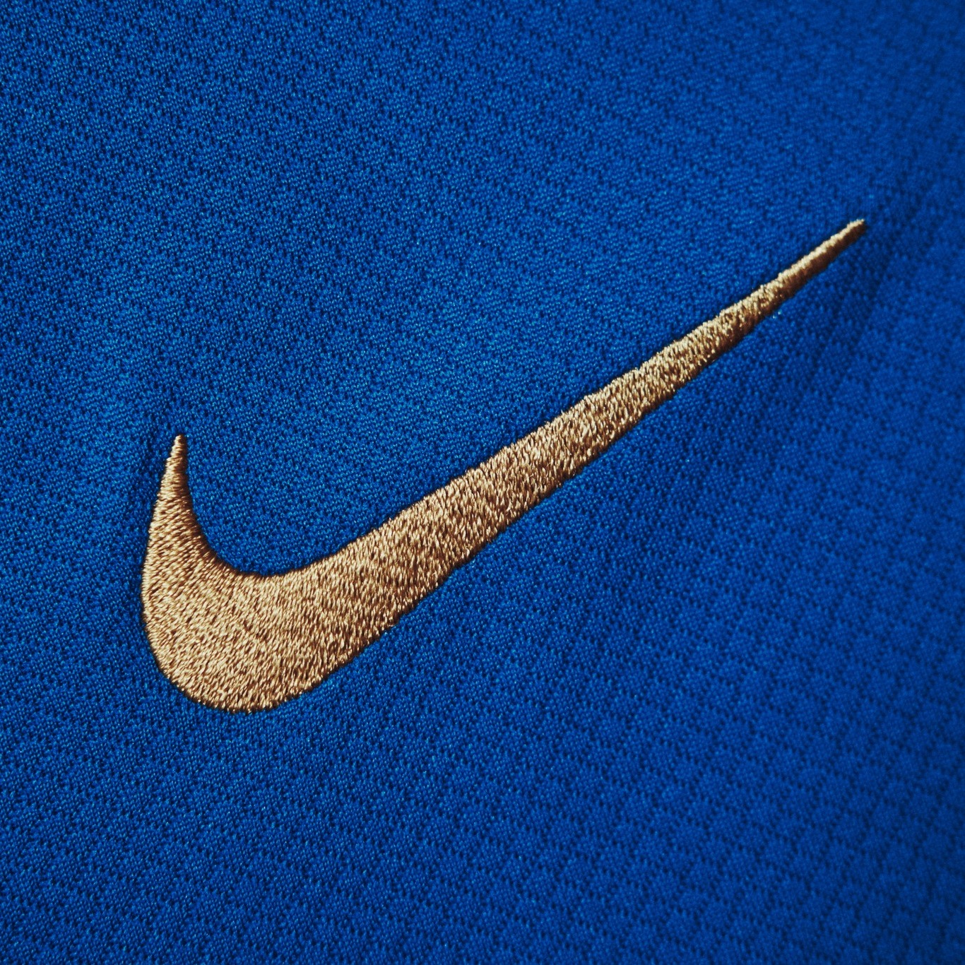 A classic polo collar and ribbed cuffs with gold trim add further detail to the shirt, which will be paired with matching blue shorts and socks.