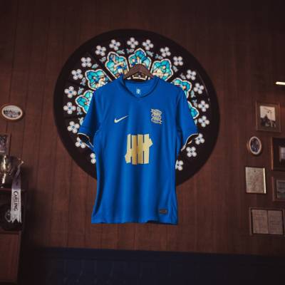 The kit features an all-blue design with gold detailing, including a gold anniversary crest dated 1875 to 2025, a gold Nike Swoosh, and Undefeated branding on the front.
