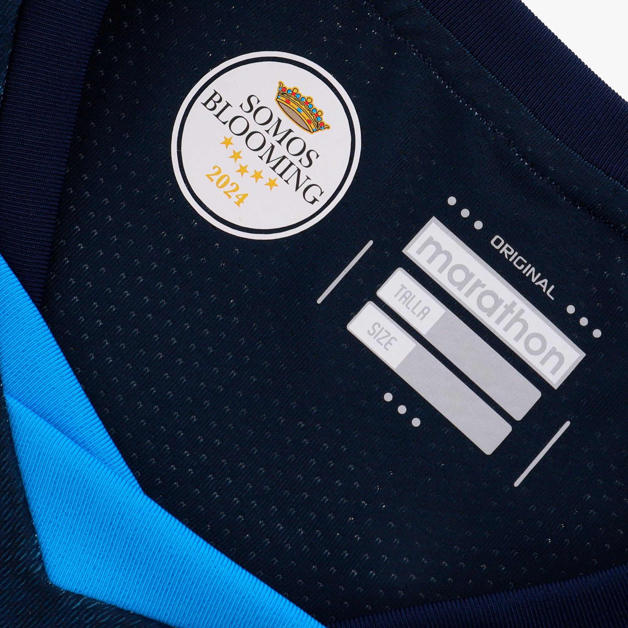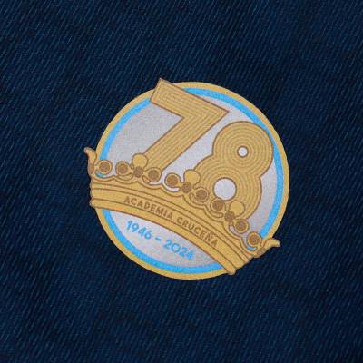 This 2024 shirt design is in shades of blue and celebrates the 78th birthday of “La Academia Cruceña” with a sublimation of the crest complete with annotations referring to each element’s significance in the team’s history since their 1946 beginnings.