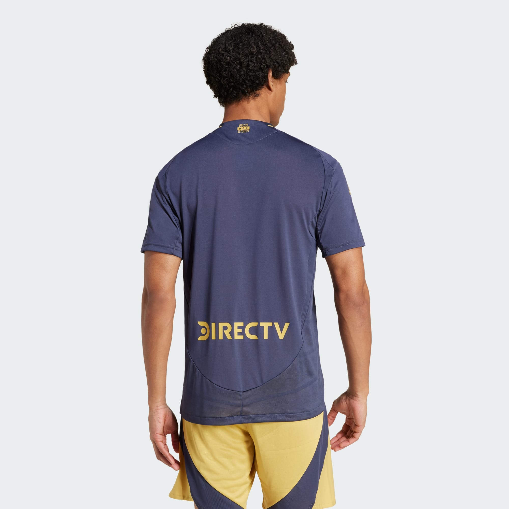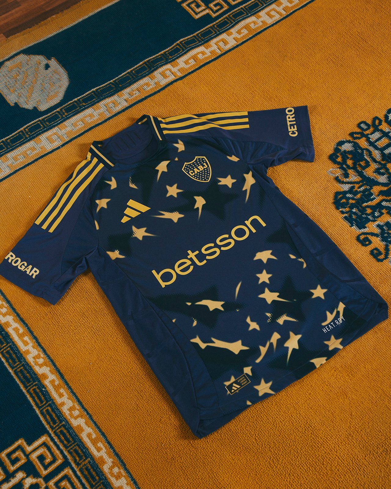 The adidas shirt features a Shadow Navy base, scattered with a pattern of gold stars symbolising Boca’s achievements. The club crest, adidas logo, and sponsor branding all appear in matching gold. Three adidas shoulder stripes in gold complete the look, while a 120-year anniversary graphic is placed below the neckline on the back of the shirt.