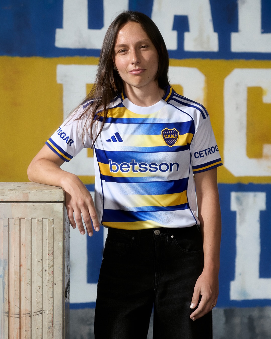 The new Boca Juniors jersey is presented with a white base and features horizontal blue and yellow striping across the front. The striped graphic references colour arrangements commonly associated with the club’s identity and appears with a soft tonal transition across the body. Matching blue adidas stripes are applied to the shoulders, while yellow piping outlines the chest panel and side seams.
