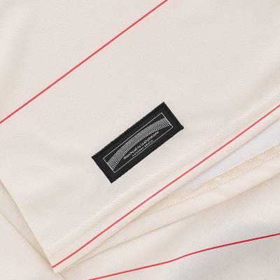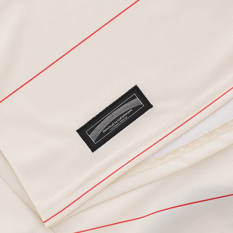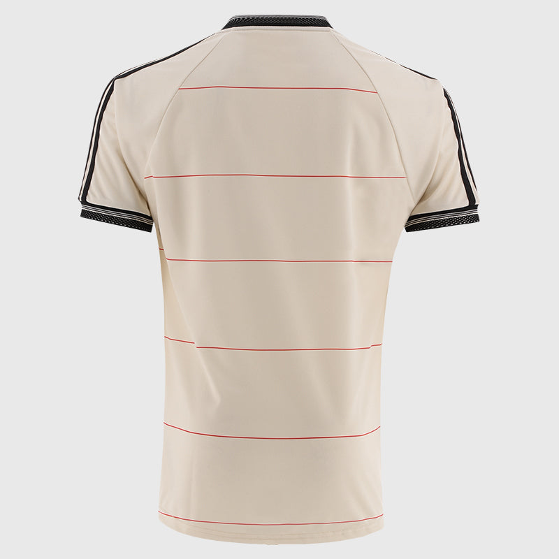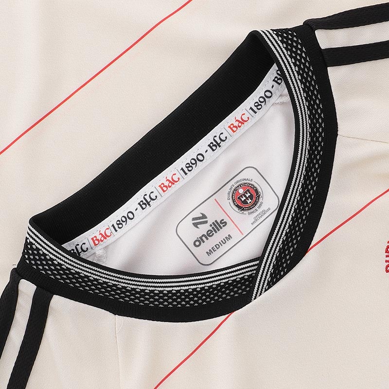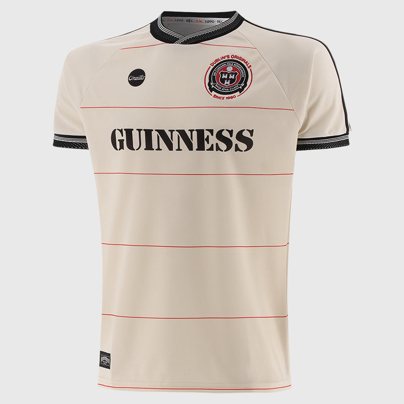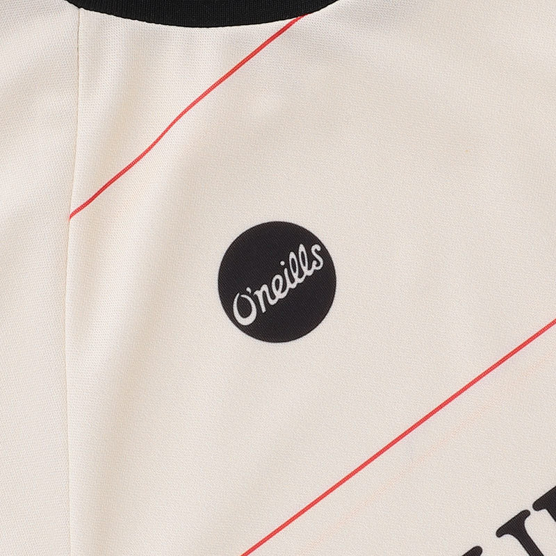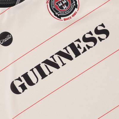 Designed by O’Neills, the new away kit features a cream body with thin red pinstripes throughout, complemented by a black and cream collar and sleeve trims. The design includes a Guinness logo from the 1980s alongside an O’Neills logo from the same era, reinforcing a connection to the city’s cultural and sporting history.