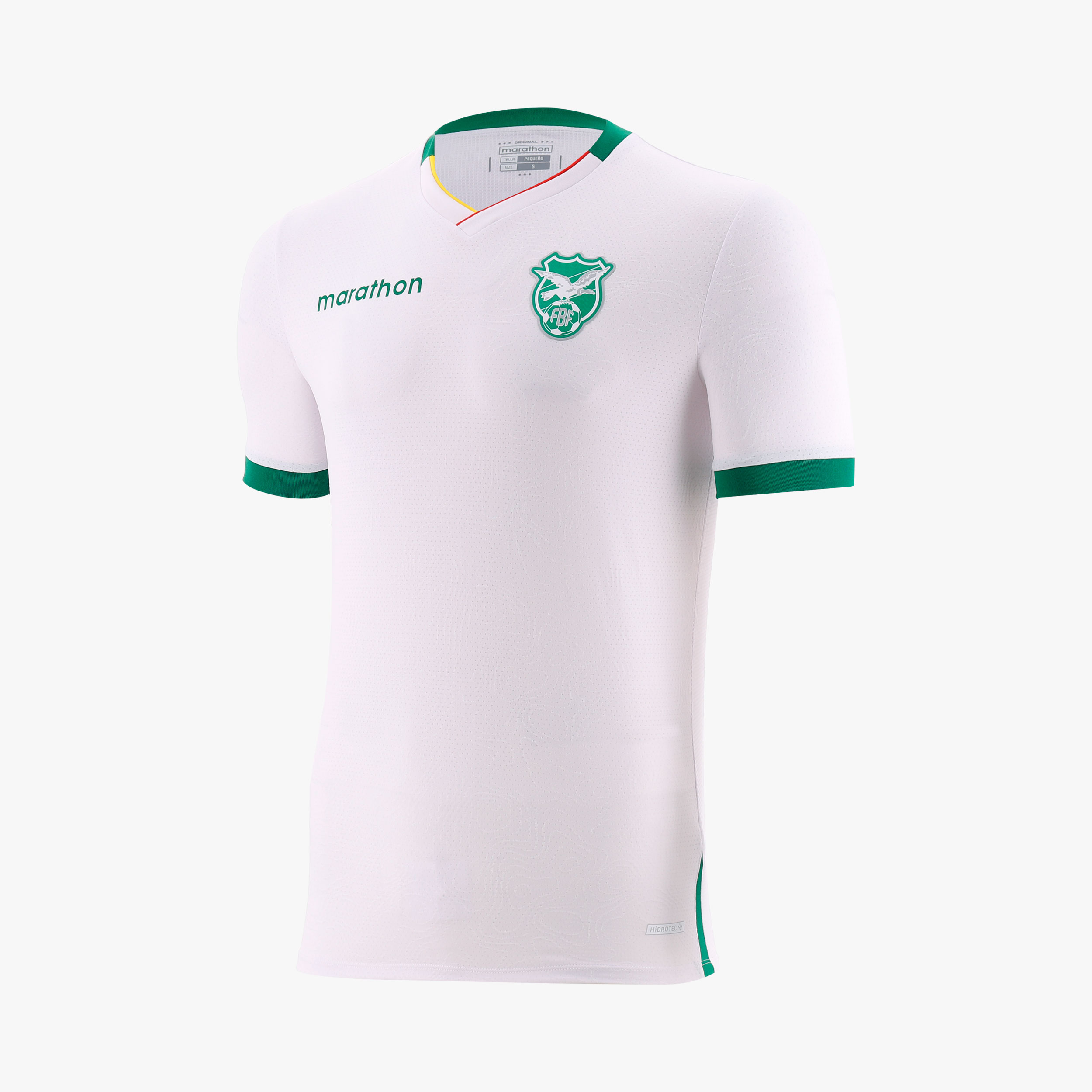 The Federación Boliviana de Fútbol crest is positioned on the chest, paired with Marathon branding on the opposite side. Official product authentication and technical labels appear along the lower hem and side panels.