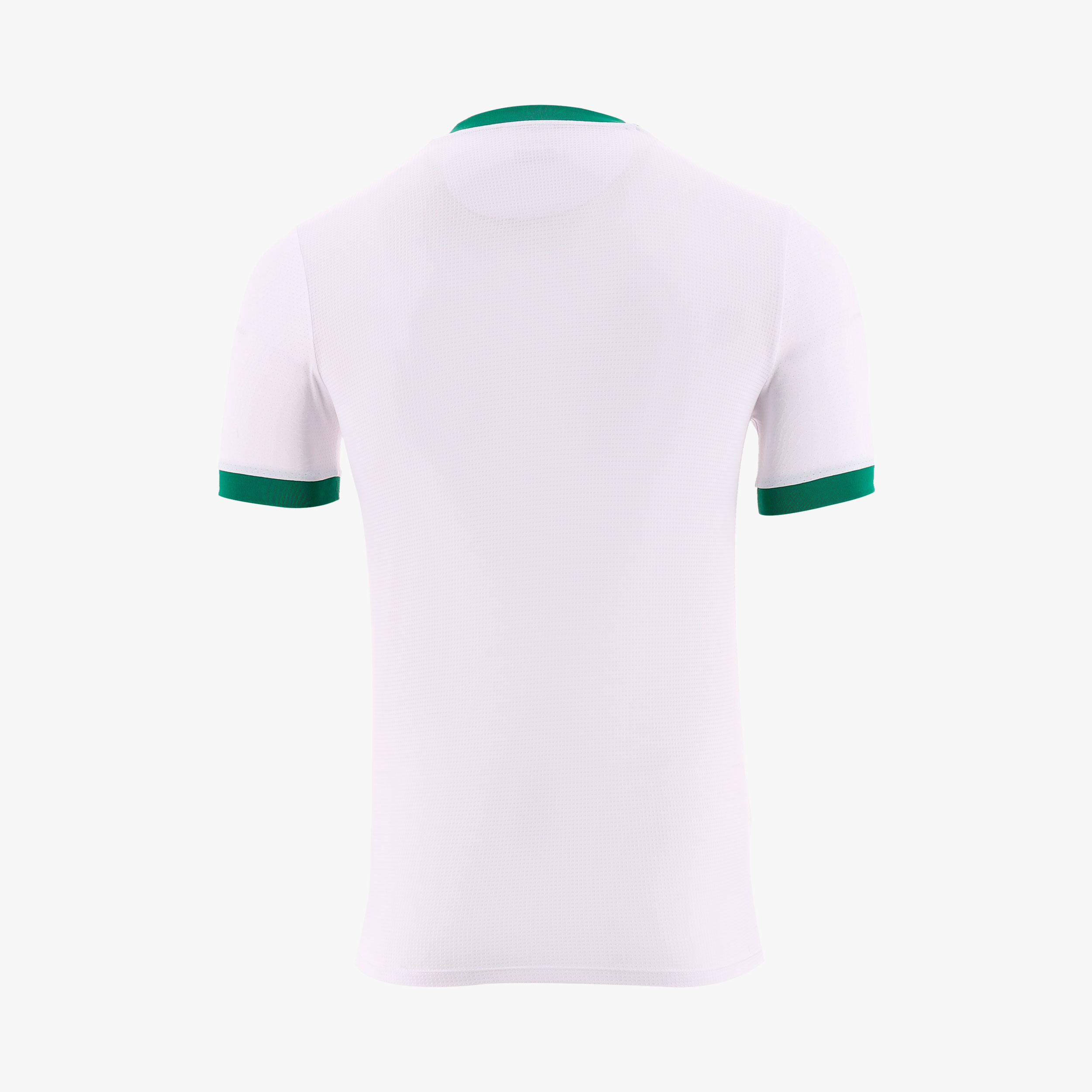 The Bolivia jersey features a white base with a tonal pattern, alongside short sleeves and a shallow V-neck collar construction. The collar is finished with green ribbed trim and an overlapping V construction, with contrasting yellow and red inner piping, while matching green trim is applied to the sleeve cuffs.