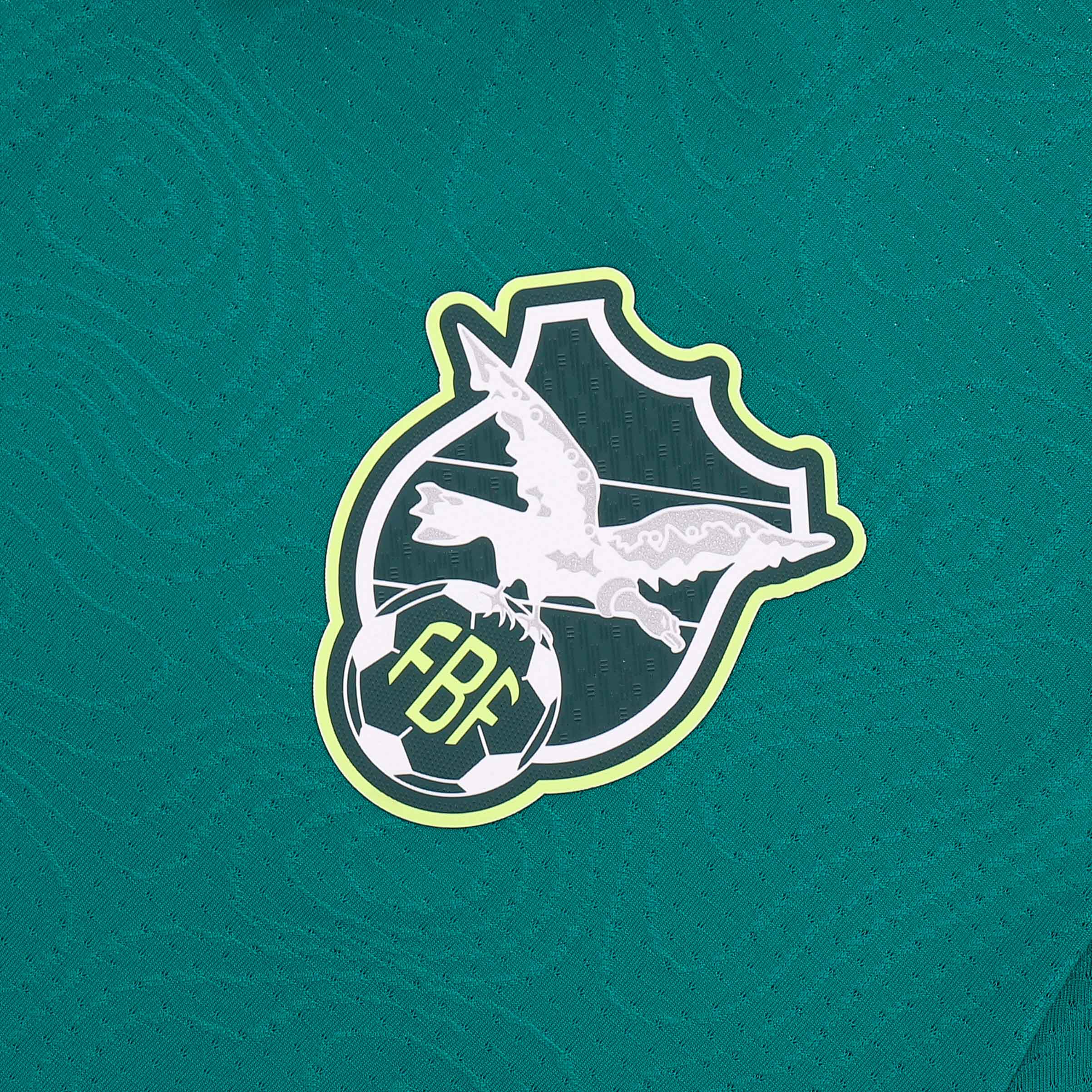 Contrast accents are applied at the collar and side panels, with ventilation zones built into the fabric to support airflow. A Hidrotec authenticity tab is positioned near the hem. The 2026 Bolivia football shirt is designed for use across international fixtures and is paired with matching deep green shorts and socks.