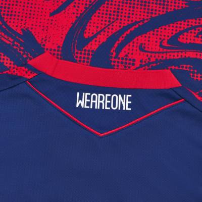 This season’s secondary away shirt features a red knitted crew neck and sleeve cuffs, with a Jacquard weave and graphic patterns inspired by modern art. The design integrates the club’s traditional red and blue colours across the front, shoulders, and sleeves.