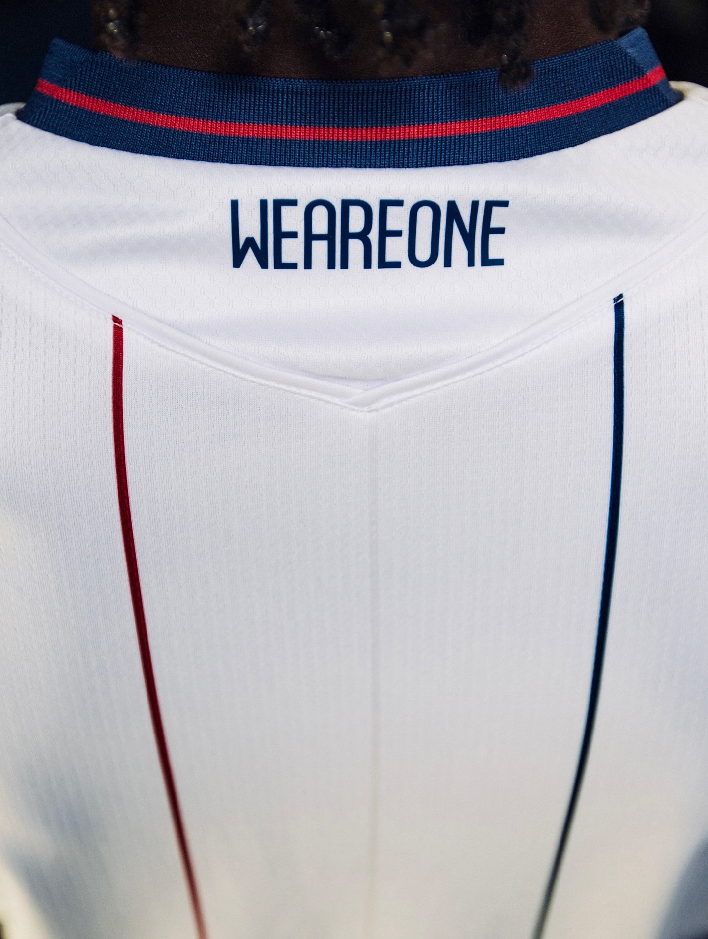 Inside the neck a label reads “Lo squadrone che tremare il mondo fa” (The team that makes the world tremble) alongside “Designed in Bologna”. On the outer back neck the phrase “WE ARE ONE” is shown in navy.