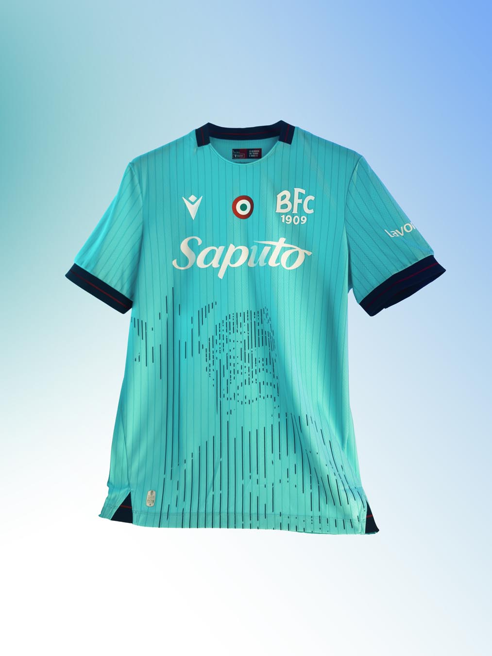 The jersey is presented in turquoise and carries a tone-on-tone pinstripe effect on the front, creating an image of the Neptune statue, a symbol of the city known locally as “Il Gigante.” The neckline is round, while the cuffs feature red and blue details. On the chest, the Macron logo appears opposite the club crest marked “BFC 1909,” with the Scudetto badge placed centrally.