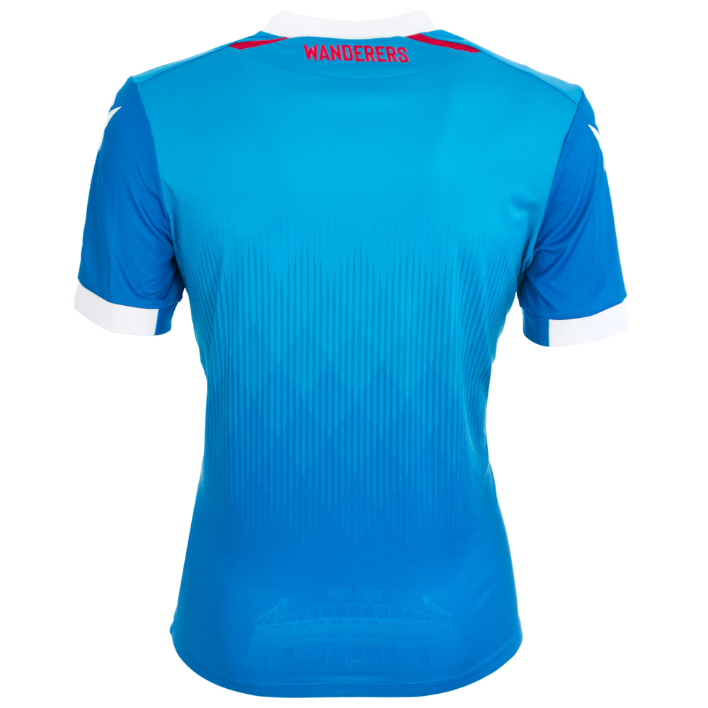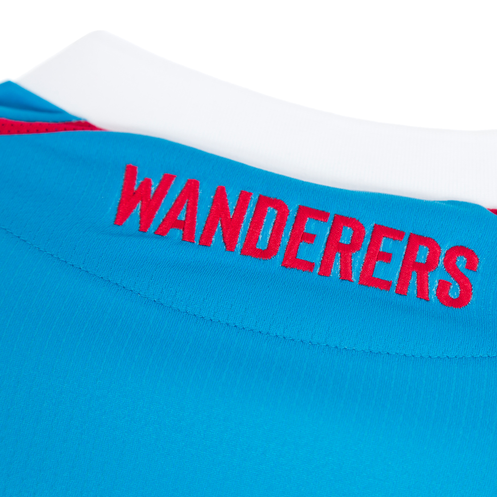 Across the back of the neck, ‘Wanderers’ is embroidered in red and the same bold blue of the shirt is utilised across the shorts and socks.