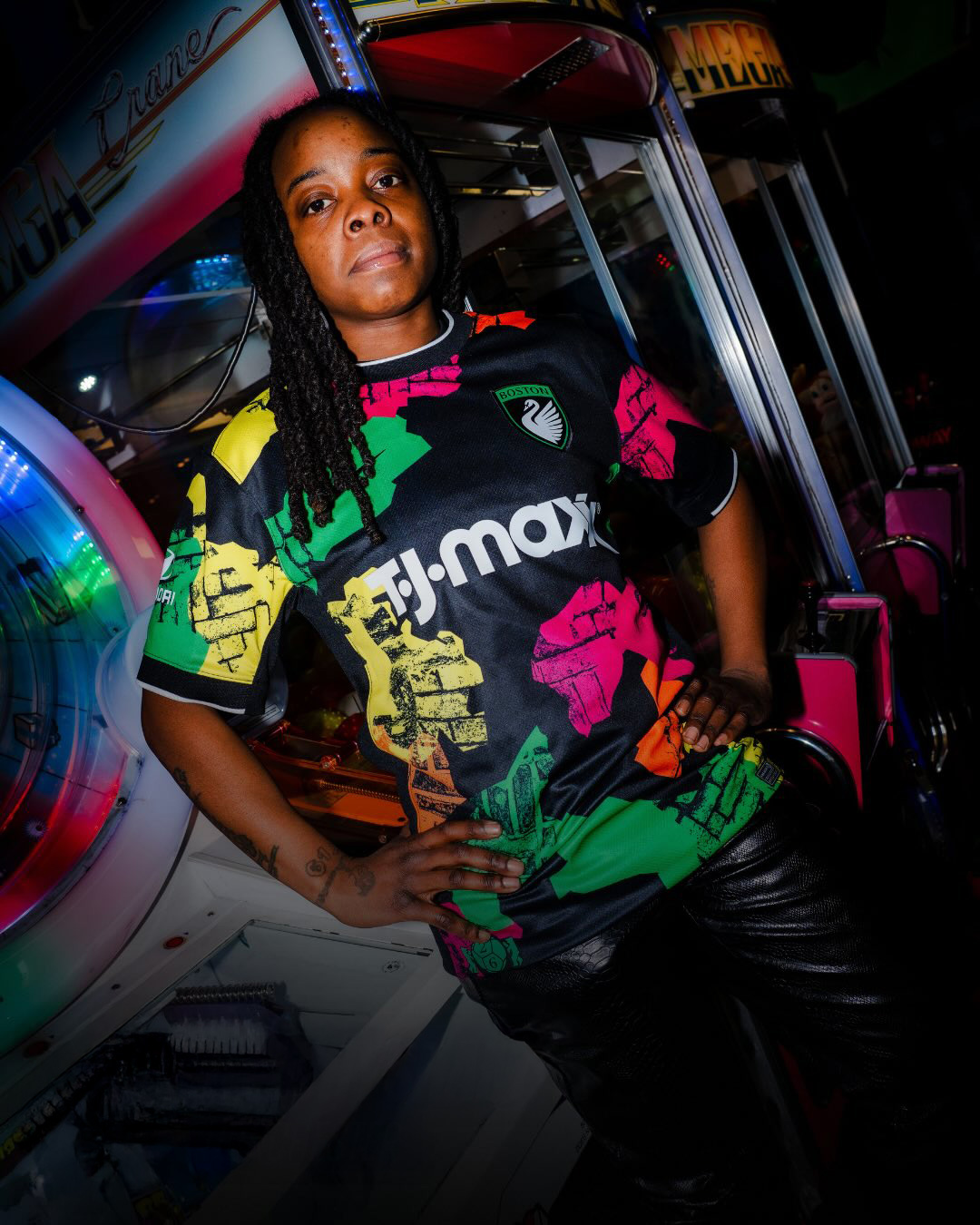 The new Boston Legacy jersey is built on a black base and features a large scale collage graphic across the front and lower body. Abstract neighbourhood inspired shapes appear in bright pink, green, yellow and orange, layered over the dark foundation. The print extends onto sections of the sleeves, while the rear panel remains predominantly black with additional colour blocking near the hem.