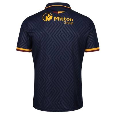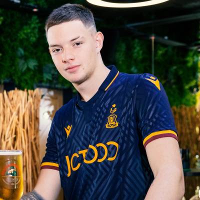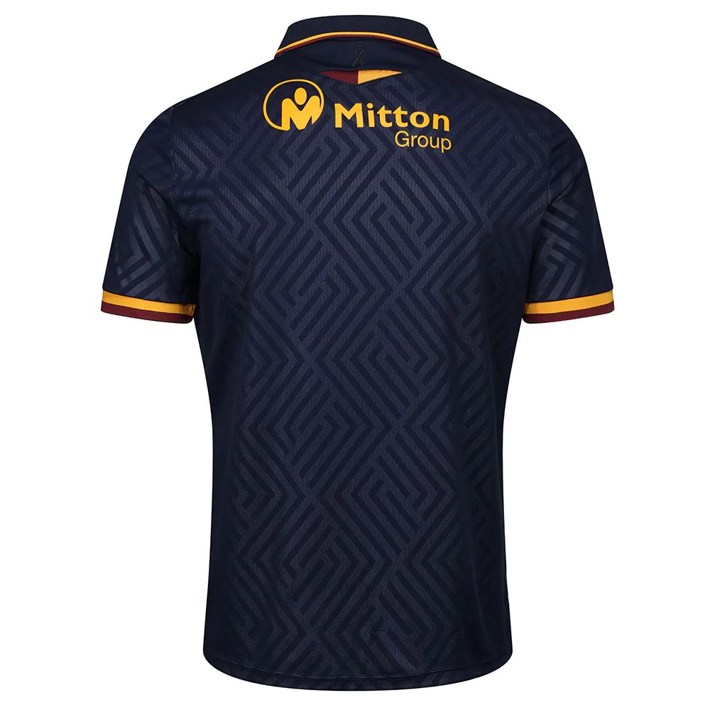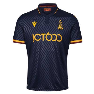 Navy shorts see Regal Foods, a club kit sponsor new for 2022/23, sublimated into the fabric, with a claret and amber trim and Macron branding adorning similarly-coloured socks. This again completes a line-up of three Bradford-based companies across the strip.