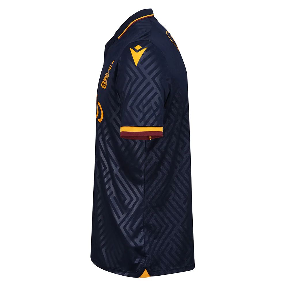 A tonal, amber, rubberised club crest - complete with a star marking the 1911 FA Cup triumph - is pressed onto a panel which is embroidered into the shirt, appearing on the front alongside the Macron logo, with similar Macron branding on either sleeve.