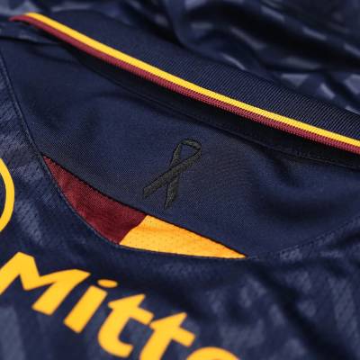 The rear of the jersey features a traditional black ribbon, paying tribute to the lives tragically lost in the Valley Parade Fire Disaster on 11th May 1985.