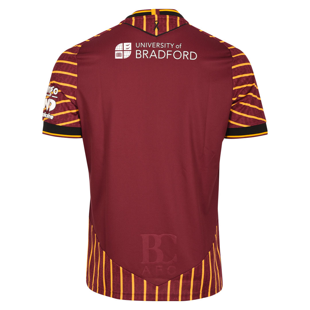 A black ribbon is stitched into the back of the collar in memory of the 56 lives lost in the Valley Parade Fire Disaster on 11 May 1985. The shirt and shorts are made from Macron Eco fabric, made from 100 percent recycled materials and certified to the Global Recycled Standard, while the back of the jersey uses Eco Micromesh for breathability during matches.