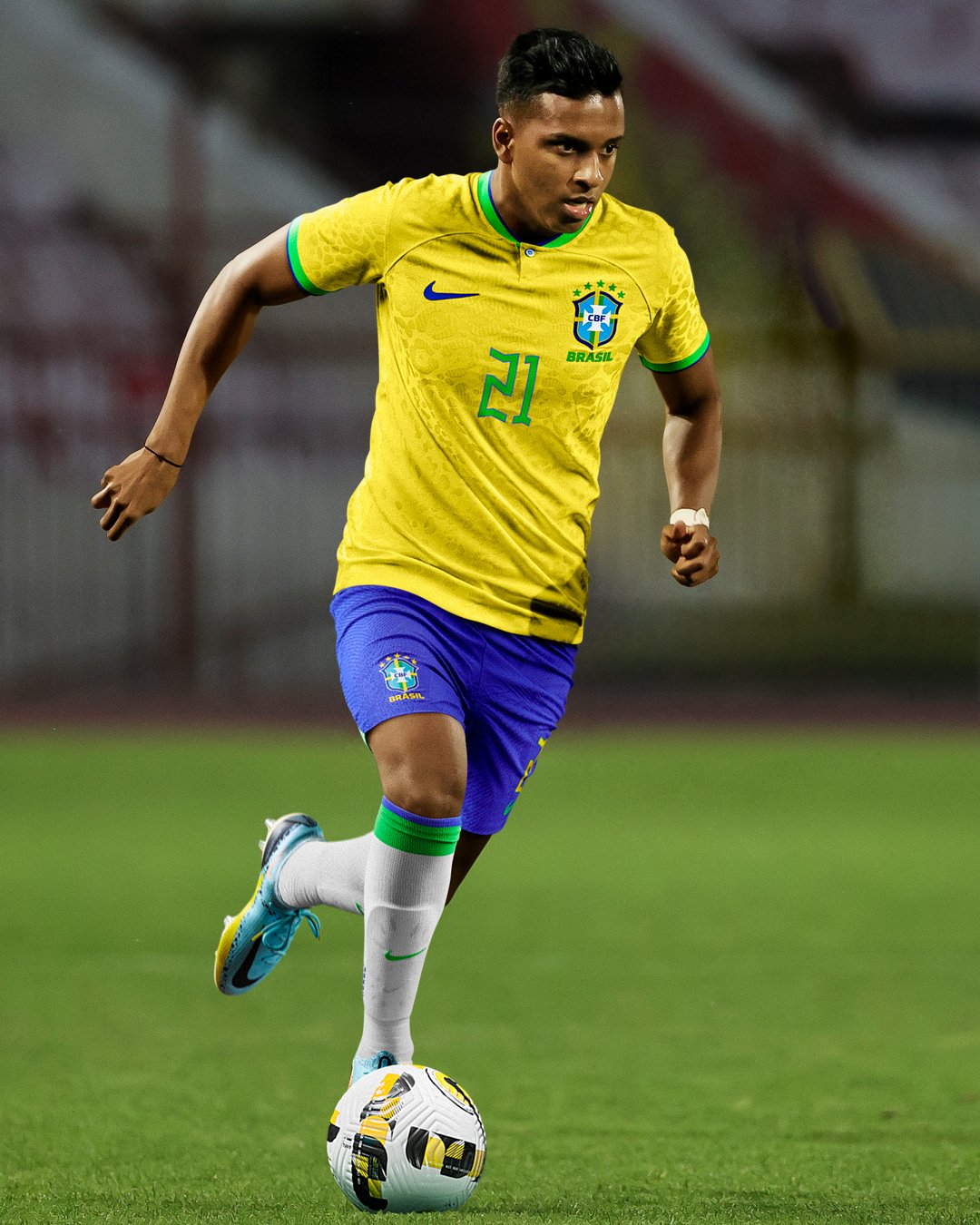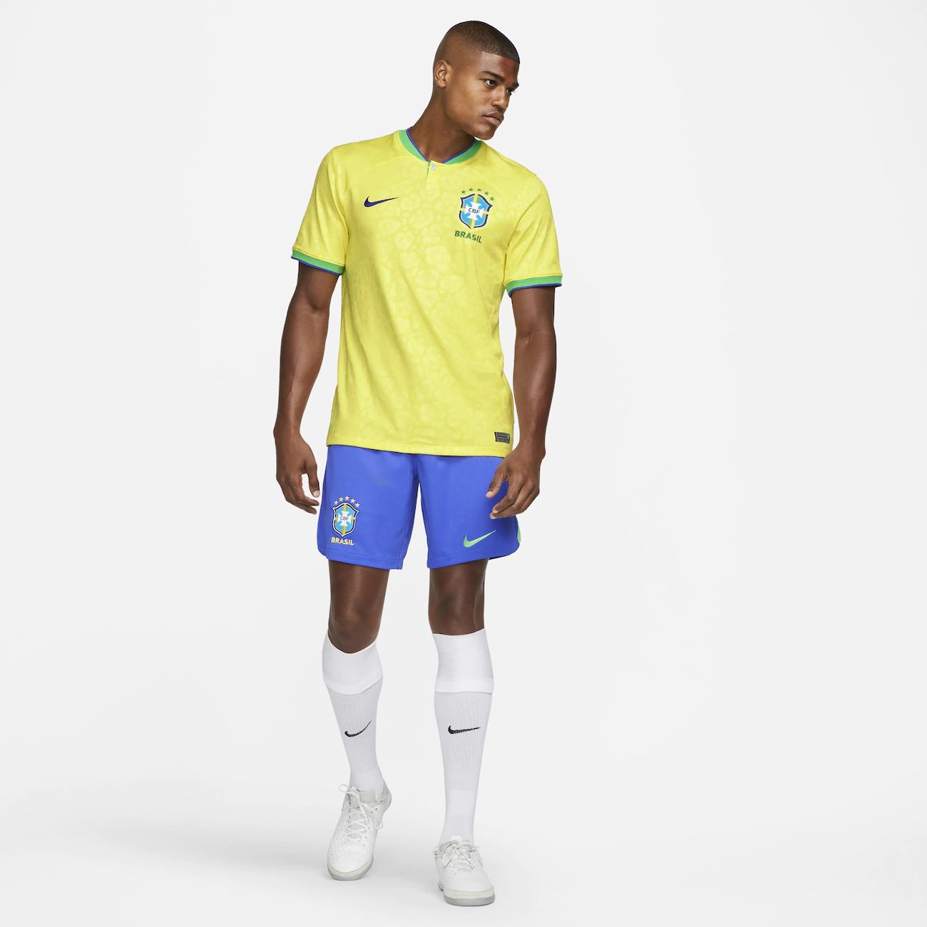 The crest is in full colour, the Nike Swoosh is, for the first time on a Brazil Home shirt, in blue, and the kit will be completed with blue shorts and white socks.