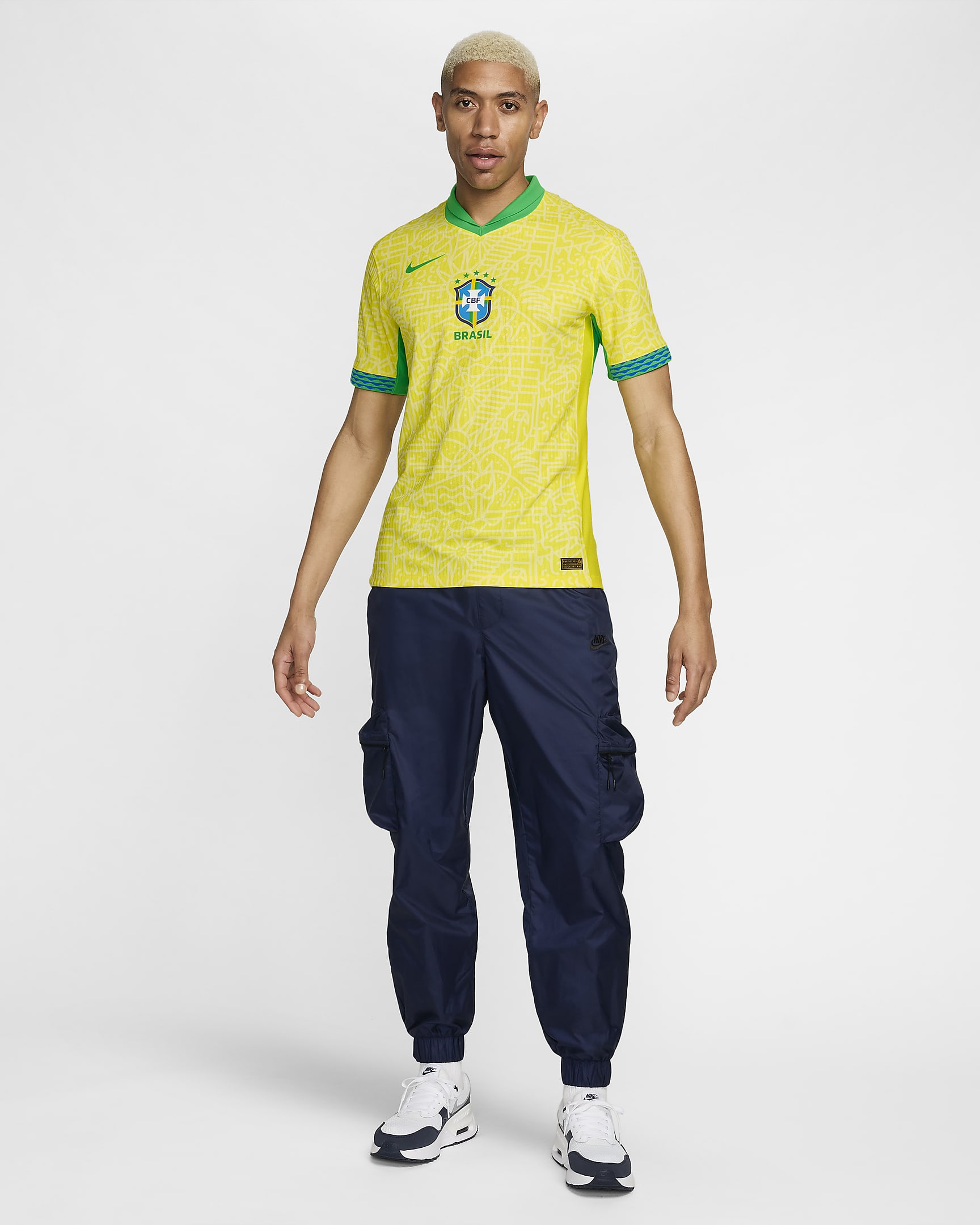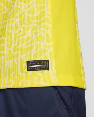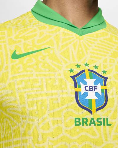 The latest Nike release for Seleção is in a patterned mix of “Dynamic Yellow” and “Lemon Chiffon” - marketed as celebrating Brazilian architecture, music and “natural wonders” - and it is embellished with “Green Spark” and, on the cuffs, blue.