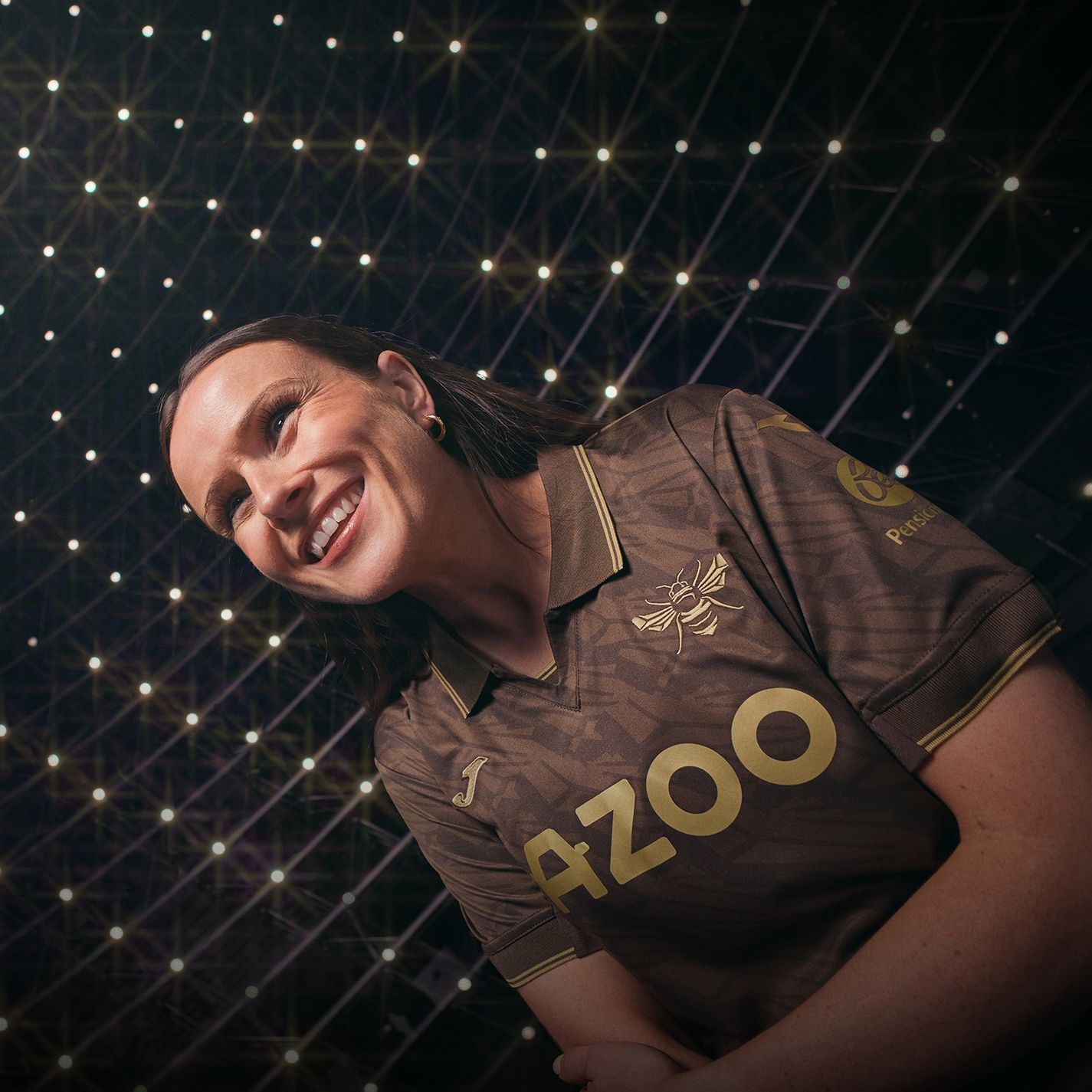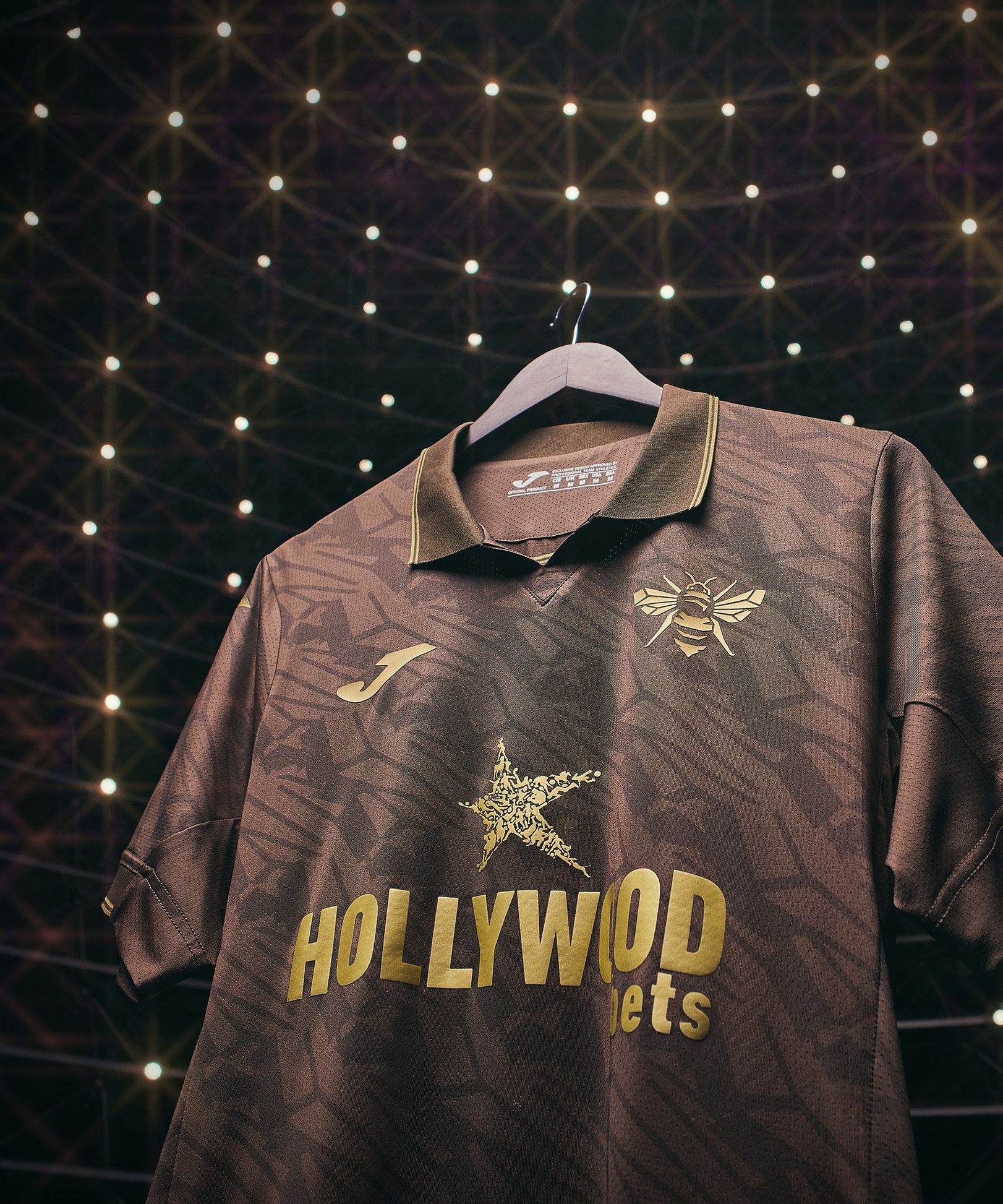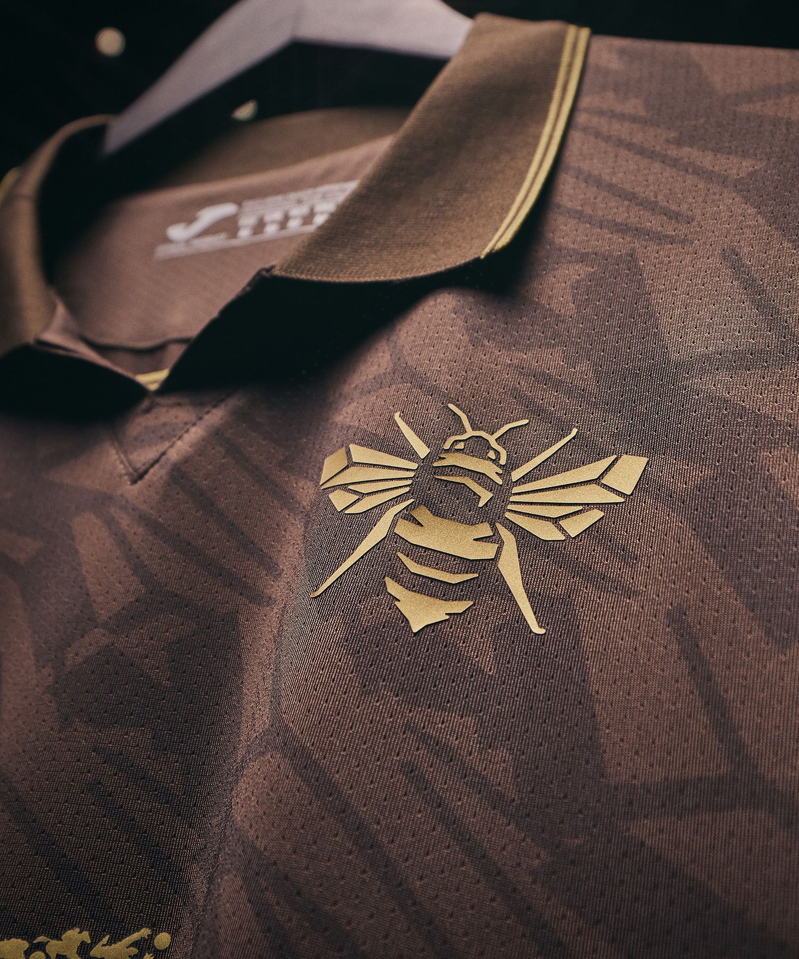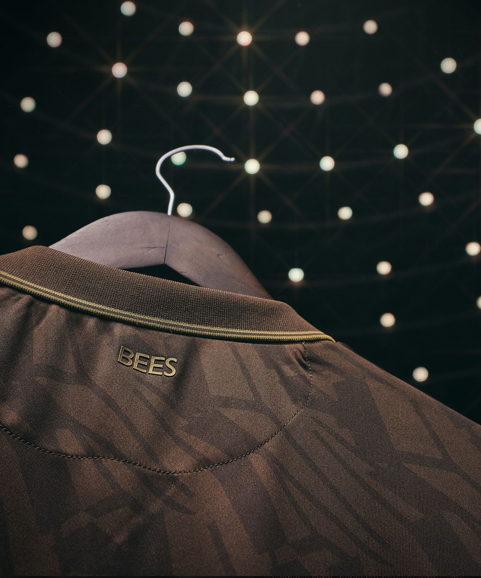 The shirt comes in a deep brown colour with gold trim, including gold detailing on the collar, sleeves, and sponsor logos. The standout feature is a repeating tonal bee-wing graphic pattern woven throughout the shirt. For the first time, the shirt features a single Brentford bee emblem on the chest. The rear neck features the word “Bees” in gold.