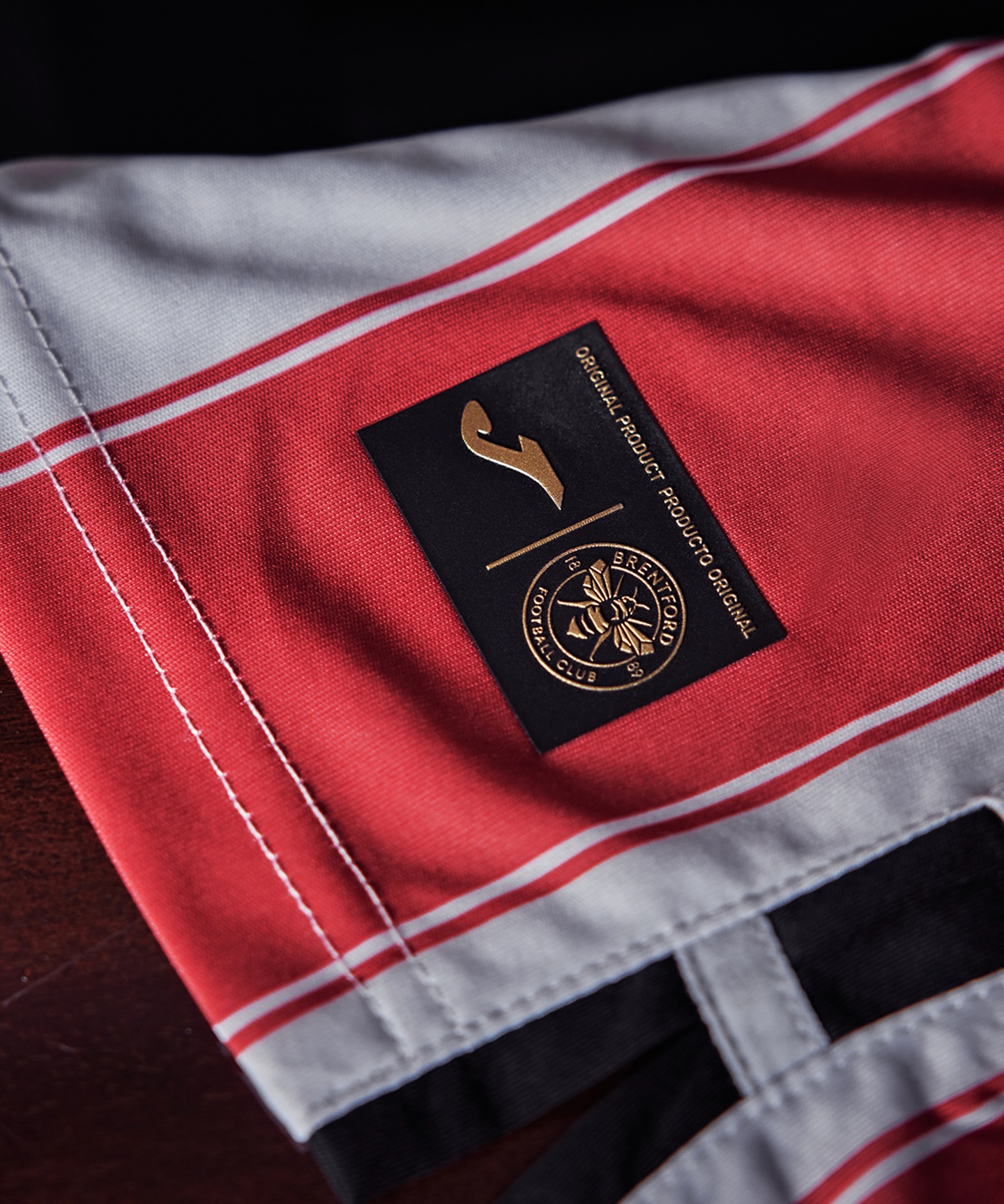 The shirt features Brentford’s classic red and white stripes, with a modern design that references the club’s heritage.