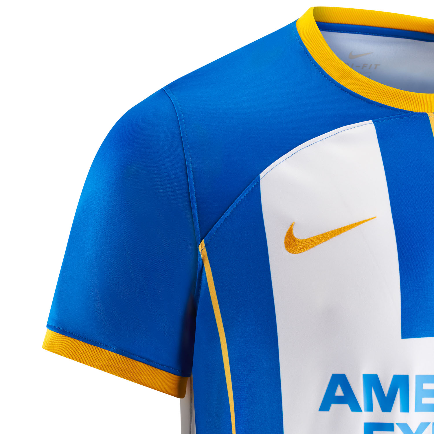 The new Nike home shirt takes inspiration from the 2018/19 season with two white and three blue stripes, with yellow detail on the front.