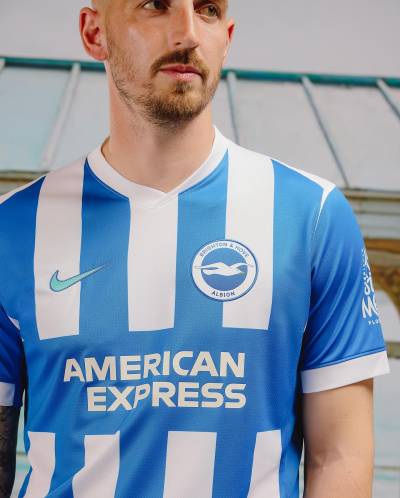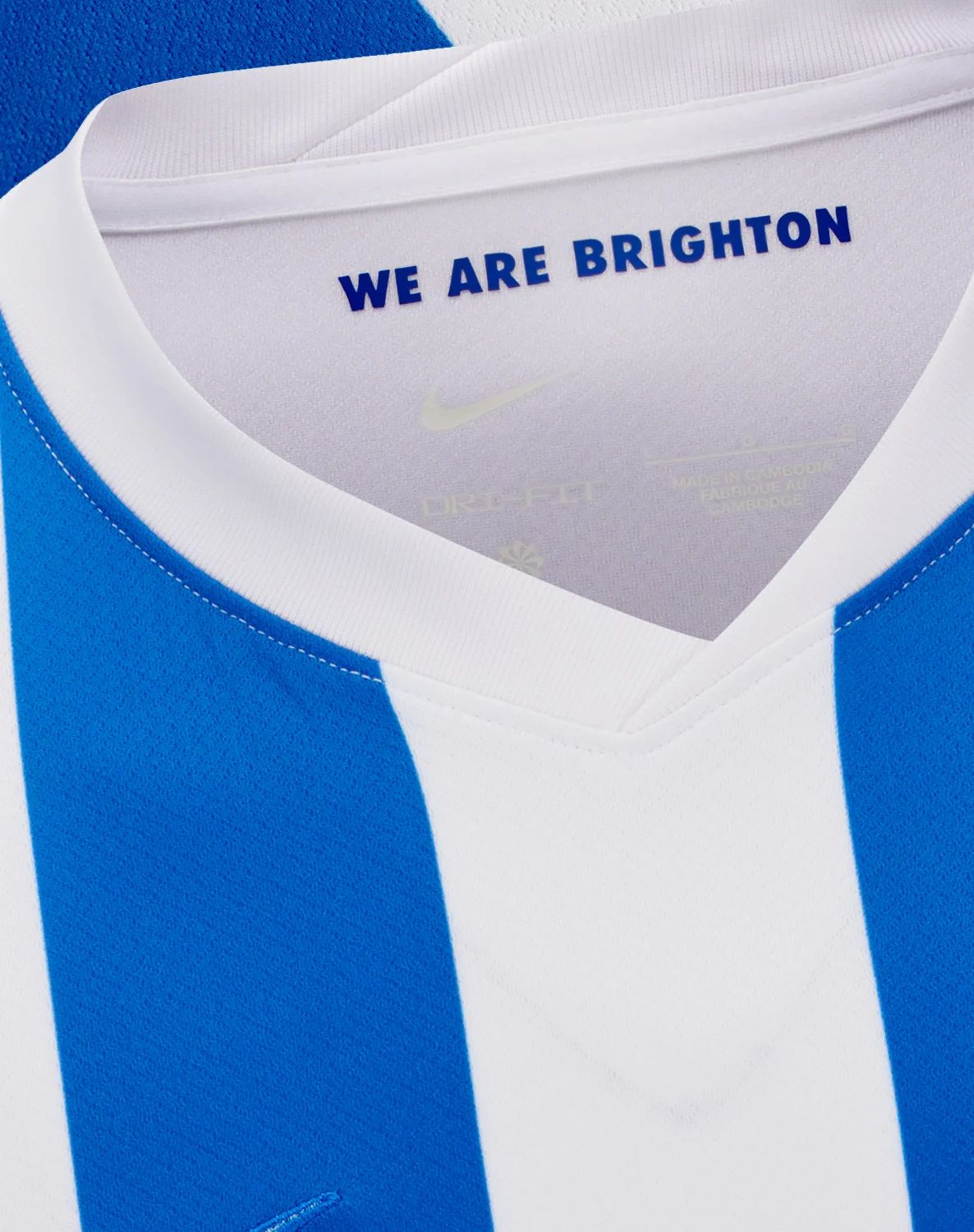 Additional hyper turq details run under the arms, complementing the royal blue shorts and socks that complete the kit, which is made with Nike Dri-FIT technology using recycled polyester fibres and features “WE ARE BRIGHTON” inside the collar.