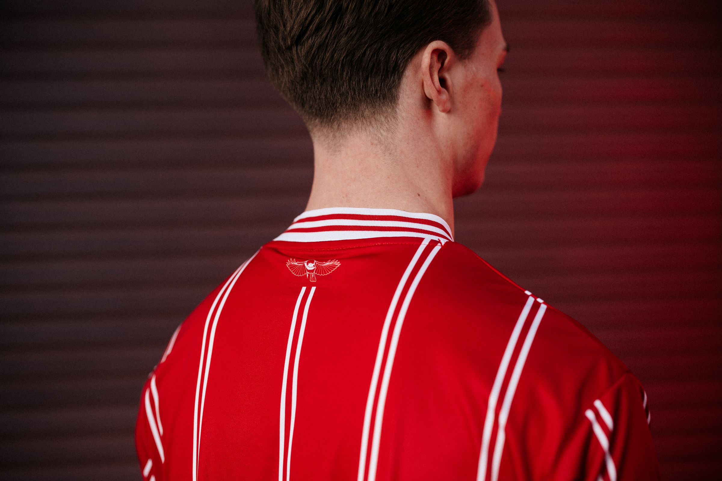 The iconic red and white pinstriped 'Hirerite' shirt from the 1989/90 season served as the inspiration for the new home strip, complete with double white lines. The Robins' new home look will be completed with white shorts and red socks.