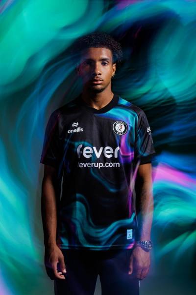 The shirt is finished with a black crewneck collar and black sleeve cuffs, while a woven O’Neills authenticity label appears near the hem, and The kit is paired with black shorts and socks, both incorporating pattern accents to match the shirt.