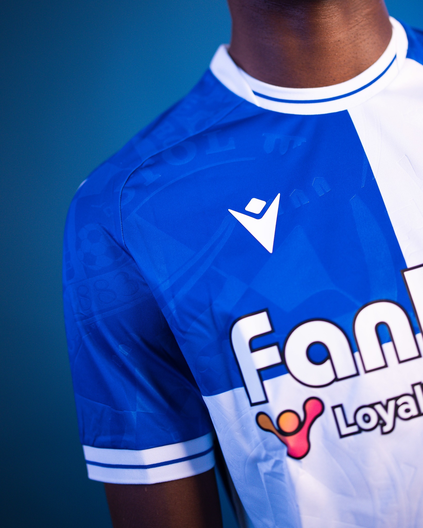 The shirt retains the club’s traditional blue and white quartered design and features an embossed pattern of club crests across the fabric.