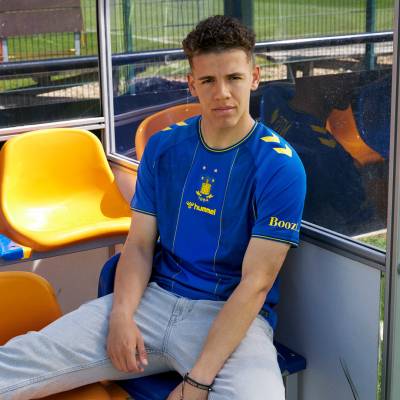The crest is centrally placed, the partner/sponsor logos/branding are in yellow and the kit is completed with matching blue shorts and socks.