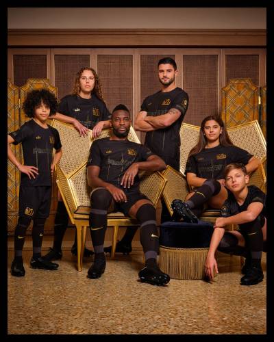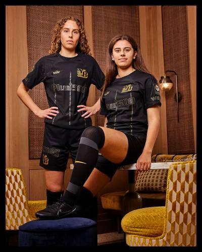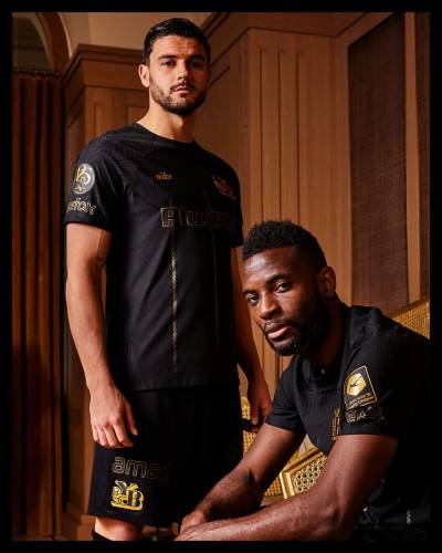 The black and gold jersey incorporates the club's old logo (1971-2002) and features an anniversary logo badge on the sleeve along with gold sponsor branding.