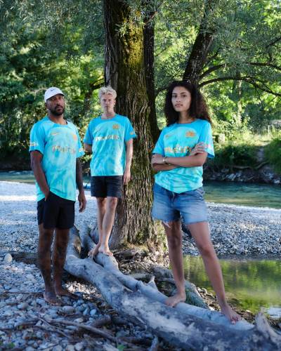 Detailing is in metallic gold with an iridescent shimmer effect and this and the tie-dye styling of the trunk nod to the water surface, with the kit completed with matching turquoise shorts and socks.