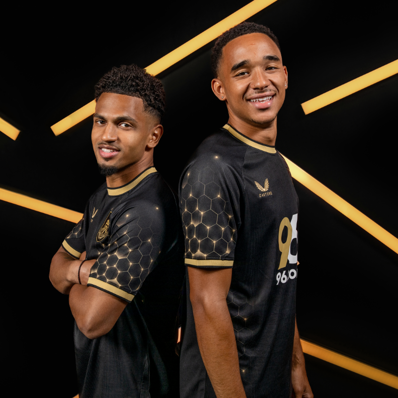 The shorts are black in Aertex fabric with concealed drawcords and a raised gold club crest, while the socks are black with a fold over gold top, feature a cushioned heel and footbed, and carry club branding on the shin with Castore branding on the calf.