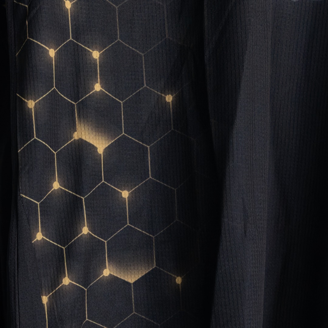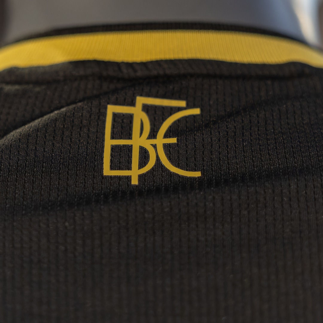 The shirt uses a black and gold colourway throughout, with breathable Aertex fabric and a gold geometric honeycomb pattern across the shoulders, sleeves and side panels that references the bees on the club crest.