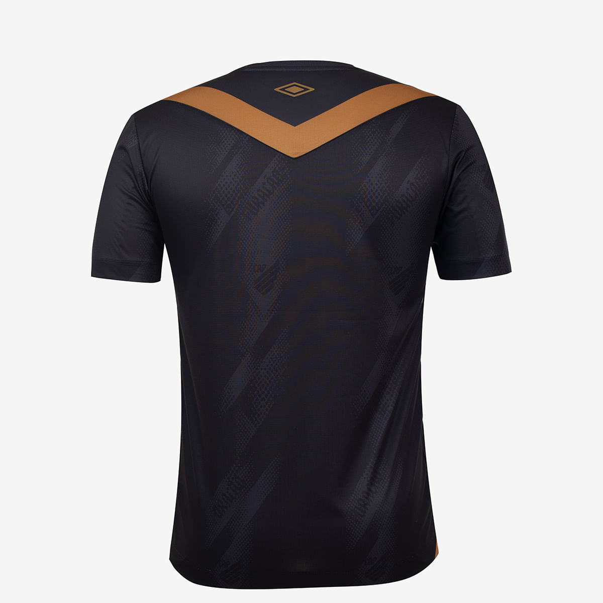 This shirt is designed with a black base highlighted by golden accents. A key element of the design is the V-shaped pattern that extends across both the front and back, creating the signature Umbro double diamond logo.