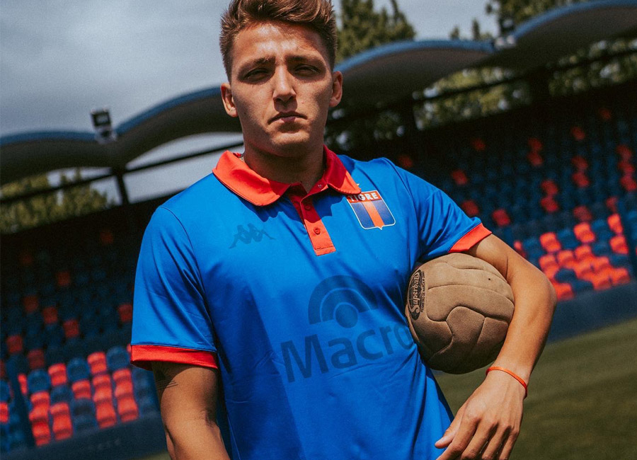 Seeing the modern addition of a red band eschewed, the shirt boasts tonal versions of the other accoutrements of today’s game, with Kappa’s “Omini” logo and the “Macro” sponsor logo in minimal-contrast blue, but does include a full-colour crest.