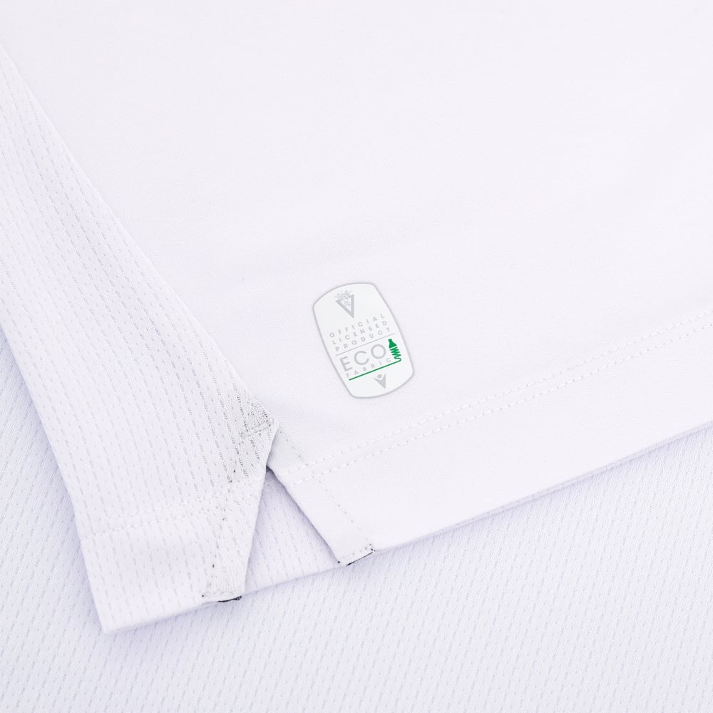 The Away shirt is predominantly white, accented with blue and black, reminiscent of the shirt worn during the 1985-86 season when Cádiz avoided relegation. It features a blue polo neck and sleeve cuffs, with a wide blue band across the chest. Navy blue geometric graphics adorn the shoulders and the sides of the white shorts.