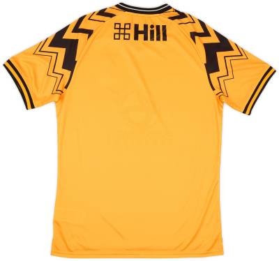 The shirt features an athletic Umbro silhouette with an offset hem, accented by amber and black ribbed cuffs, and a black performance v-neck ribbed collar with a touch of white.
